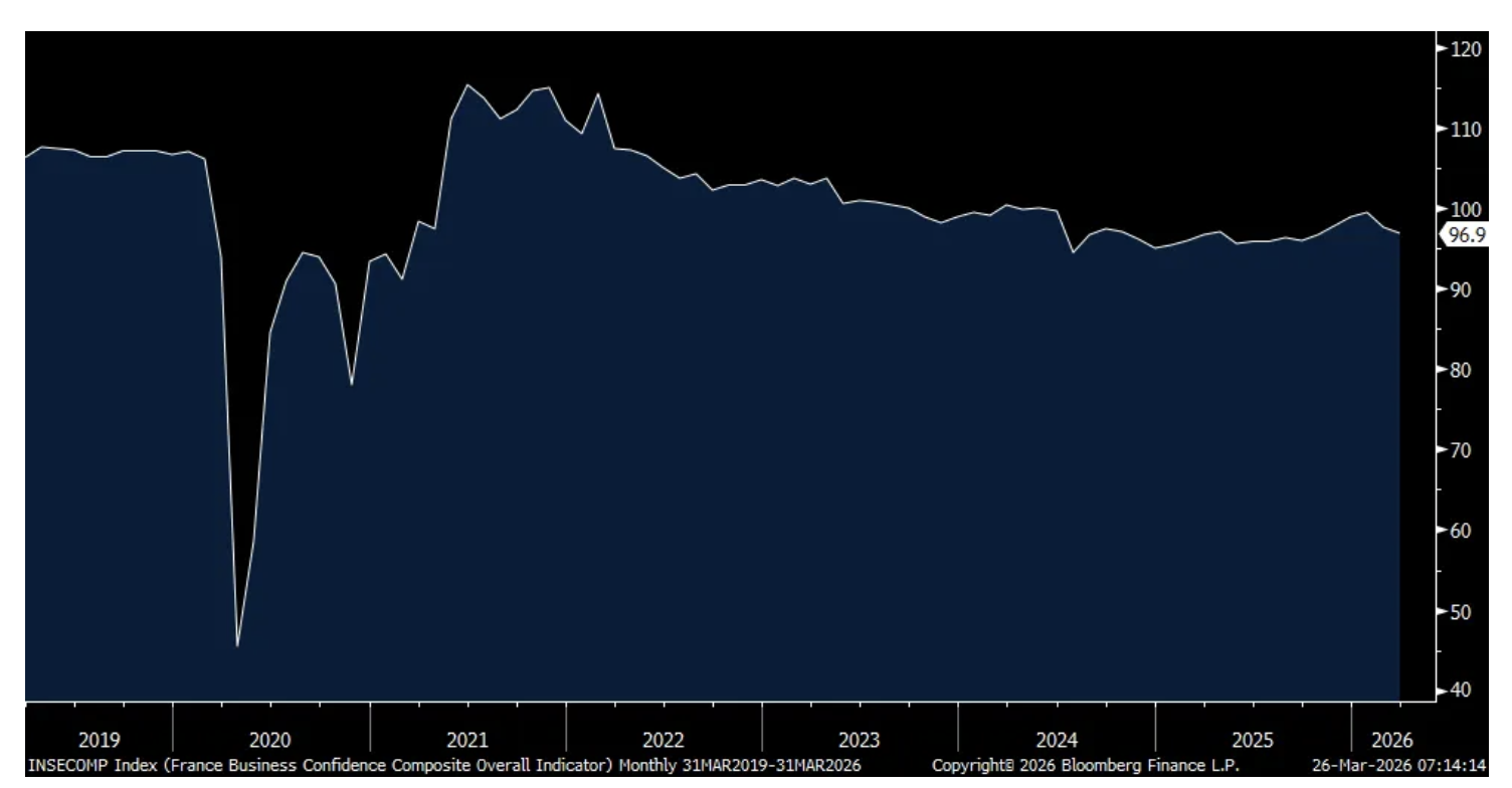 A day after the German business confidence index came out which showed a decline, today the March French business confidence index held at 97, one point above the estimate. A drop in manufacturing confidence was offset by a lift in retail, employment and construction confidence. Services were unchanged. Nothing market moving here.