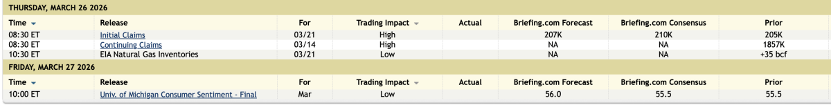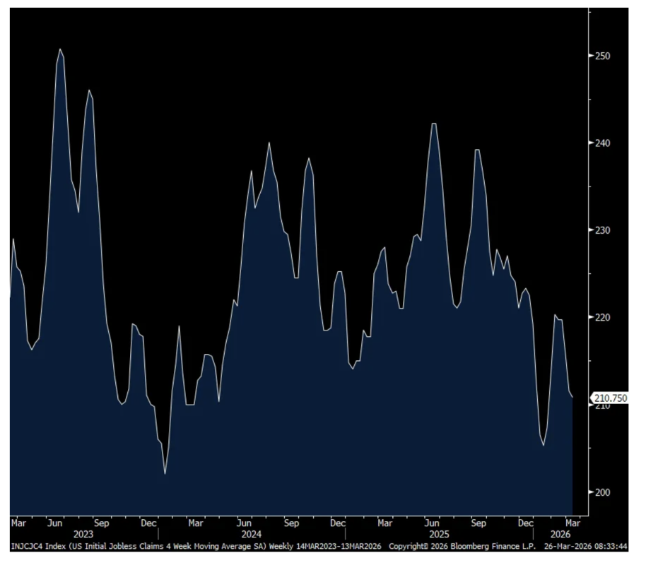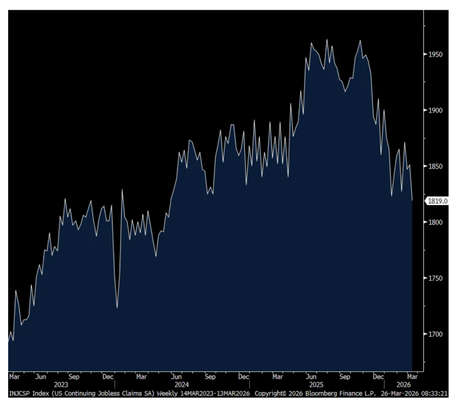 For the week ended 3/21, initial claims rose by 5k to 210k as expected but still remaining very low. The 4 week average was unchanged at 211k. Continuing claims, for the week ended 3/14, fell to 1.819mm from 1.851mm which interestingly is the lowest since May 2024. Is that because people are finding new jobs or because their benefits are expiring? We’ll get a clue next week with March payrolls.