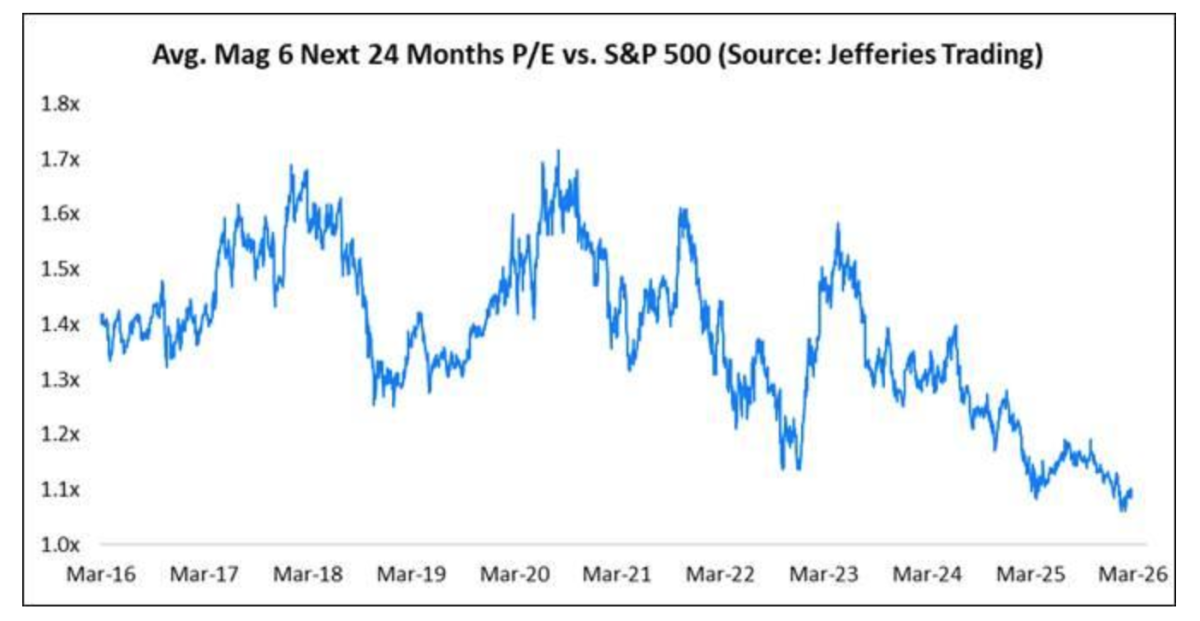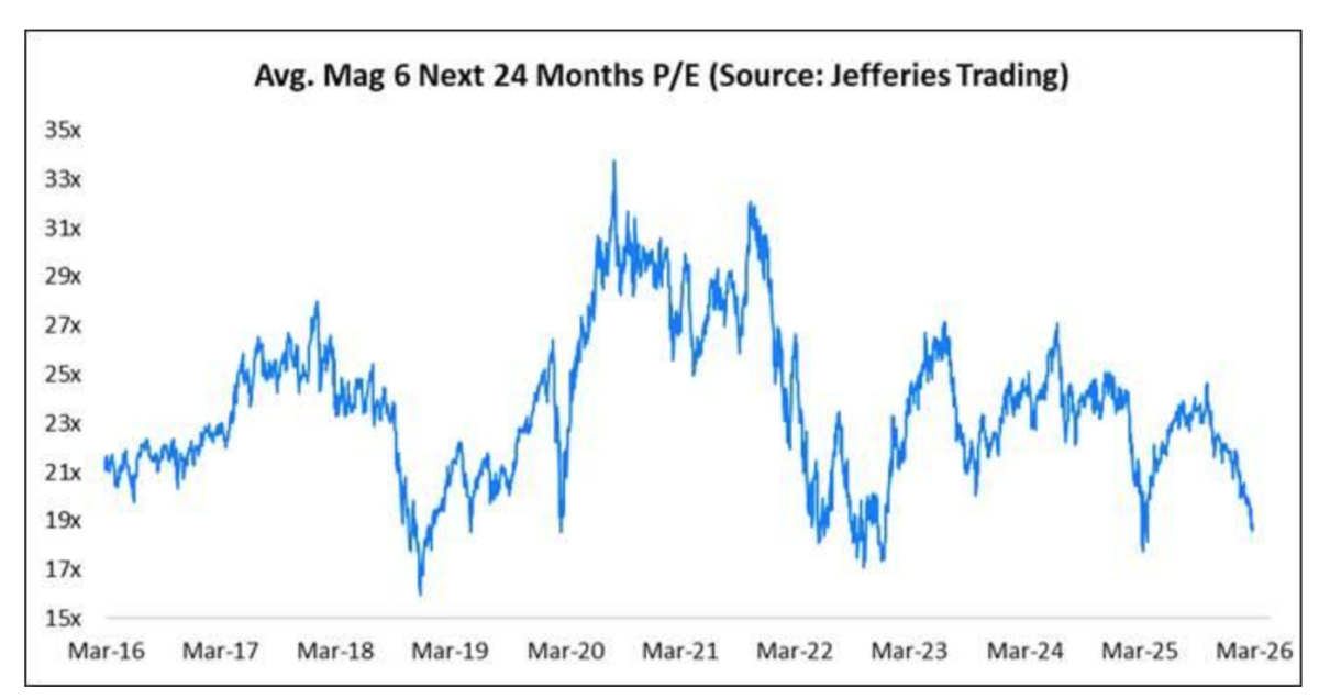 * MAG 7 valuations (excluding Tesla) is down to 19-times vs. 17-times low over the last decade: