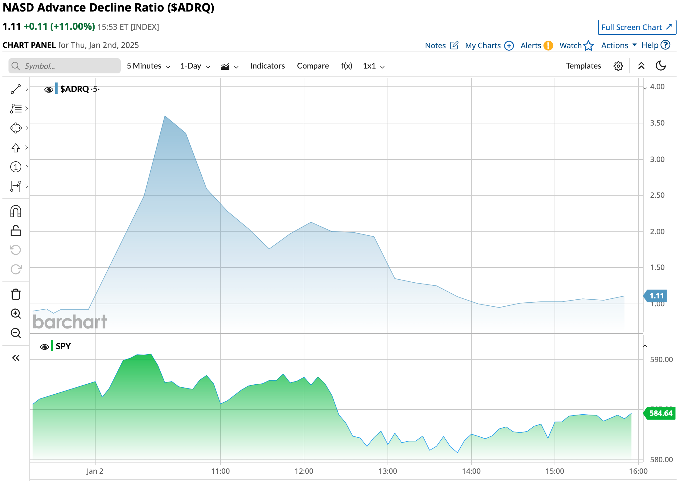 On whoosh lower to only +12 handles from +46 handles (only minutes ago!) I evened up my short Index calls by purchasing SPY $586.79 and QQQ $511.44.