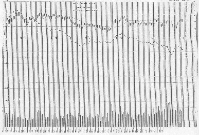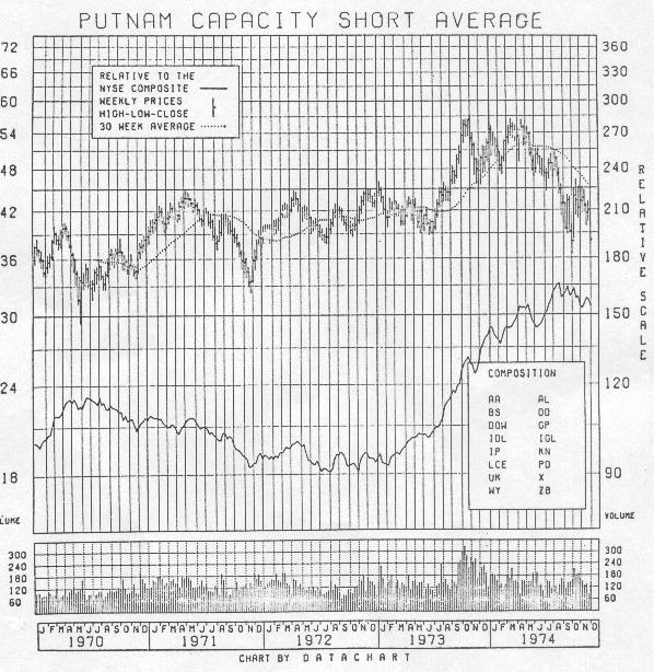 And what about value stocks in 1973; the U. S. Steel's that Putnam were dumping at five times earnings to buy Baxter at fifty times? We had an index called the "Putnam Capacity-Short Average" to track the basic industrial/commodity cyclical sector, which was as depressed an area as you could get in an already-depressed market (in an effort to draw attention to the stocks, we called it the Capacity-Short Average to highlight the fact that many basic industries were running out of excess capacity back then). This, too, is a "real-time" chart from the end of 1974; note its soaring relative strength line during 1973 and 1974 and the fact that the index itself barely broke its 1973 low in 1974 while the DJI was tailspinning from 800 to 580.
