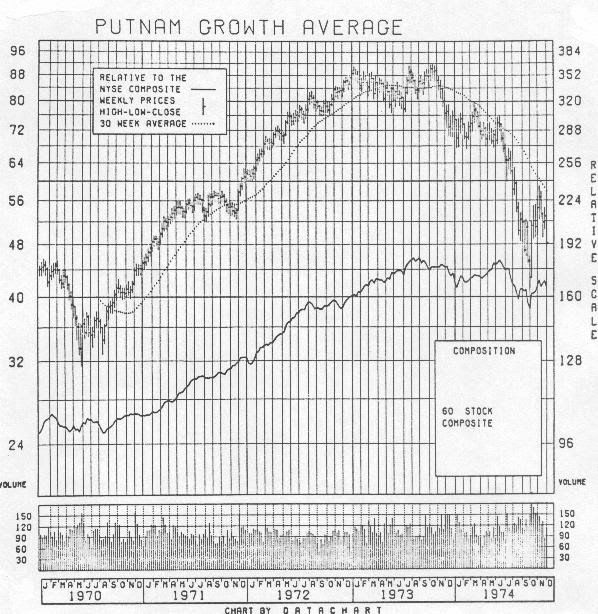 And just what did the Nifty Fifty look like back then? The chart on the next page is a weekly chart of the Putnam Growth Average from 1970 through the end of 1974, exactly as it appeared in one of my regular weekly reports at the time (the solid line on the chart, as well as on the other charts in this report, is a relative strength line). The Putnam Growth Average is thus not a "reconstructed" index of growth stocks -- it is the "Nifty Fifty" universe we were actually using back then. (There were, in fact, actually sixty stocks which met all three of our criteria for inclusion: 1) A billion-dollar market cap; 2) A five- year growth rate of at least 15%, and 3) Consistent earnings growth; no single quarterly earnings point could be more than 20% away from a least-squares line drawn through the past five years of quarterly earnings.)
