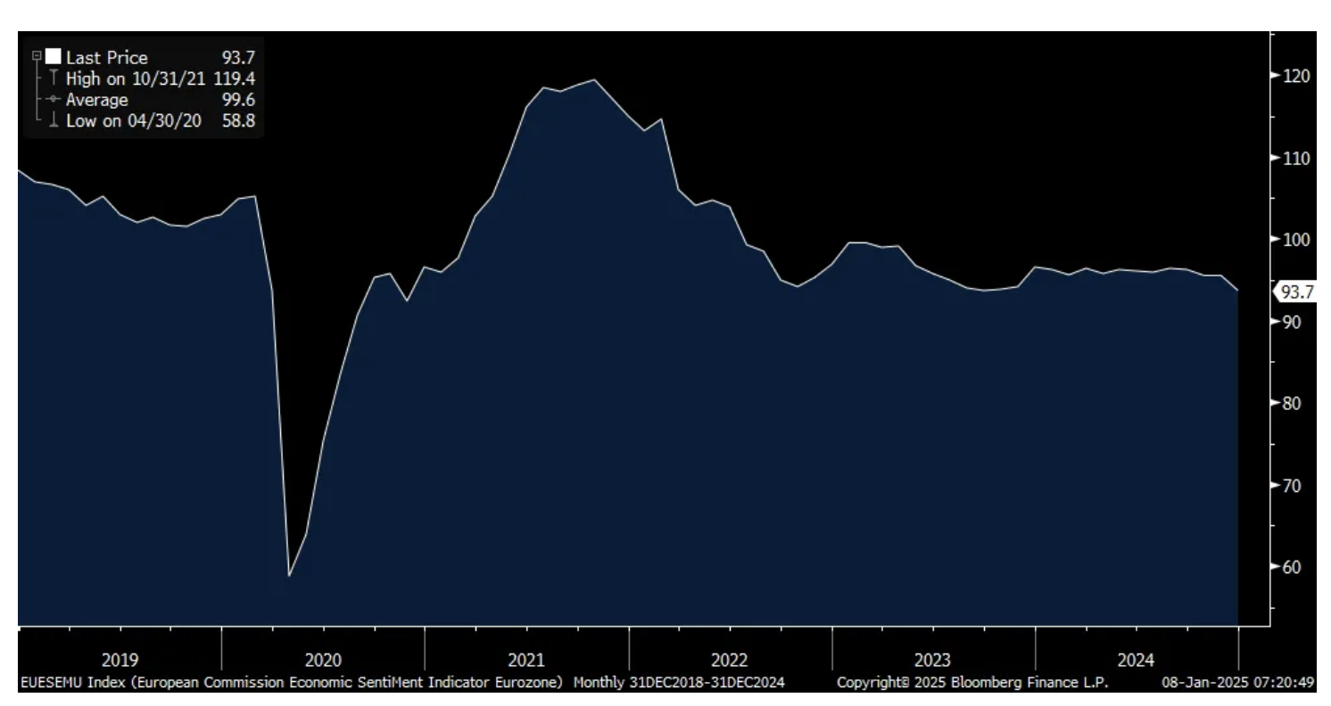 Economic confidence in the Eurozone in December weakened further to 93.7 from 95.6 and the estimate was for no change. That matches the lowest since November 2020. Manufacturing confidence led the decline, only partly offset by a gain in services confidence. Consumer confidence fell to the lowest since February and retail and construction were little changed. Bottom line, Europe's economy is barely growing and with the weak euro too, it will be very interesting to hear what Corporate America says during earnings season about their business in this region.