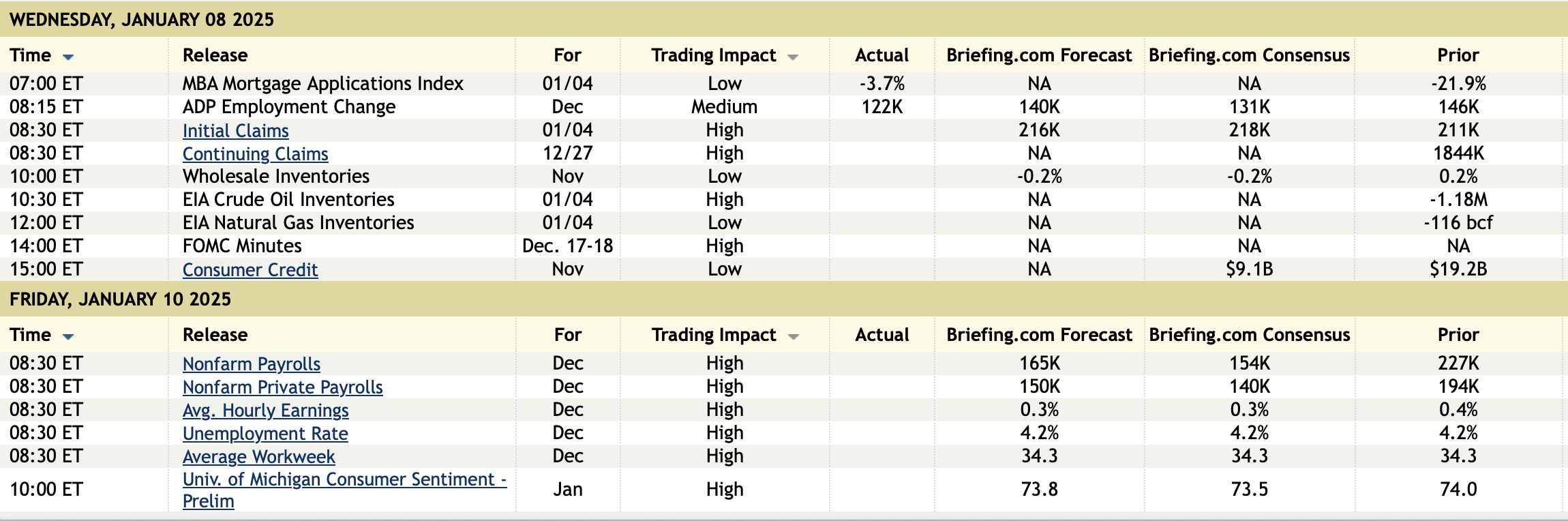ADP said “The labor market downshifted to a more modest pace of growth in the final month of 2024, with a slowdown in both hiring and pay gains.” To quantify the downshift, it’s really vs the 2023 gains as the 3 month average is now 151k vs the 6 month average of 138k, the 12 month average of 152k and vs the 2023 average of 209k. The private sector estimate for Friday’s BLS report is 140k.