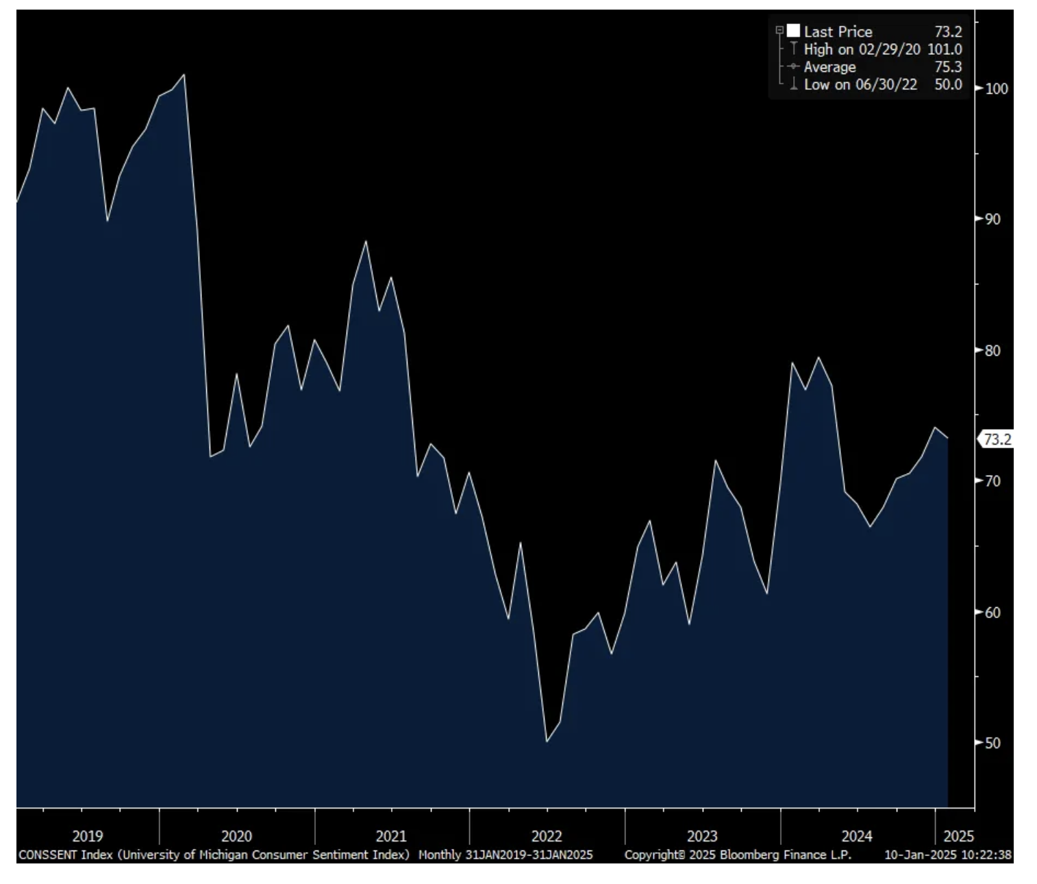 The first UoM consumer confidence read of the year comes in at 73.2 vs 74 in December and just below the estimate of no change of 74. The two key internals were mixed as Current Conditions rose 4.8 pts m/o/m but were offset by a 3.1 pt drop in Expectations. One yr inflation expectations jumped to 3.3% from 2.8% . That’s the highest since November 2023 and the 5-10 yr look also went to 3.3% from 3%. That’s the highest since 2008.