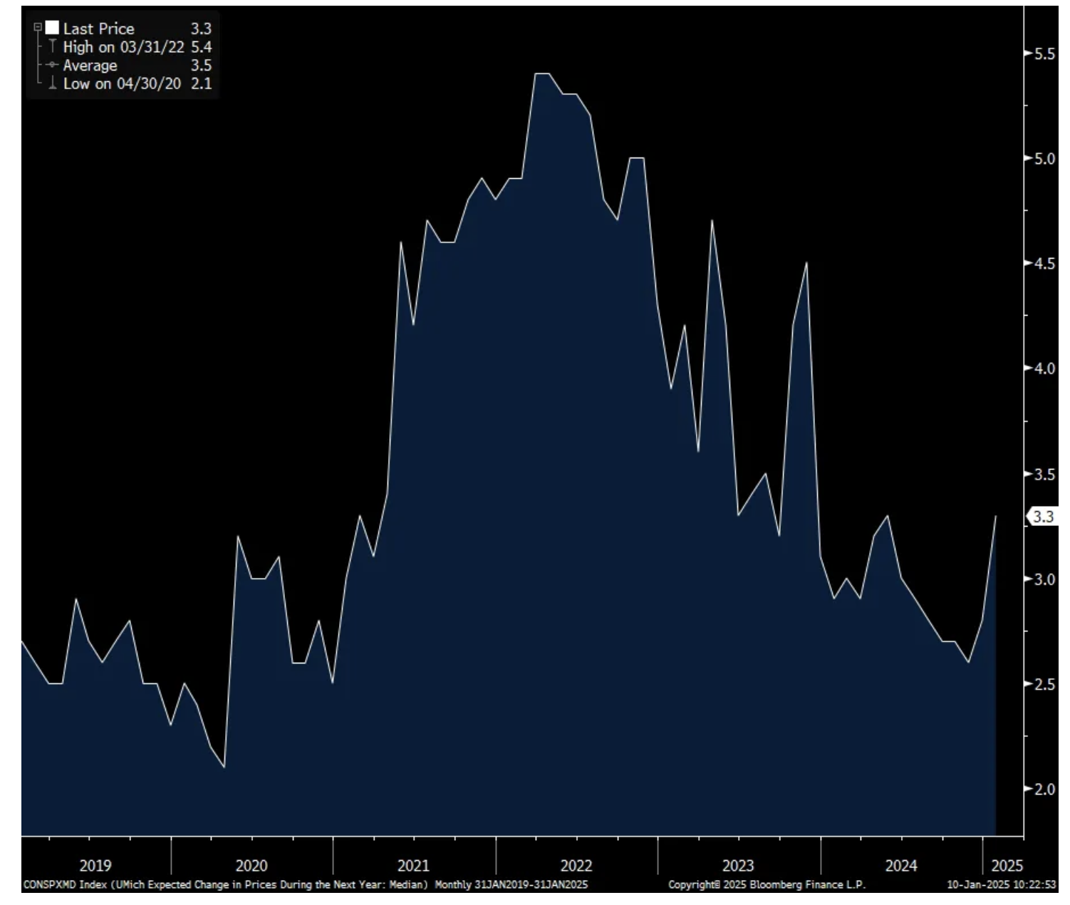 This is what the UoM said on the pop in inflation expectations, “inflation expectations rose across multiple demographic groups, with particularly strong increases among lower-income consumers and Independents…Inflation expectations are being shaped by beliefs about future policy. The share of consumers worried about the prospect of tariff hikes continues to rise. Nearly one-third of consumers spontaneously mentioned tariffs, up from 24% in December and less than 2% prior to the election. These consumers generally report that tariff hikes will pass through to consumers in the form of higher prices, thus pushing up their inflation expectations.”