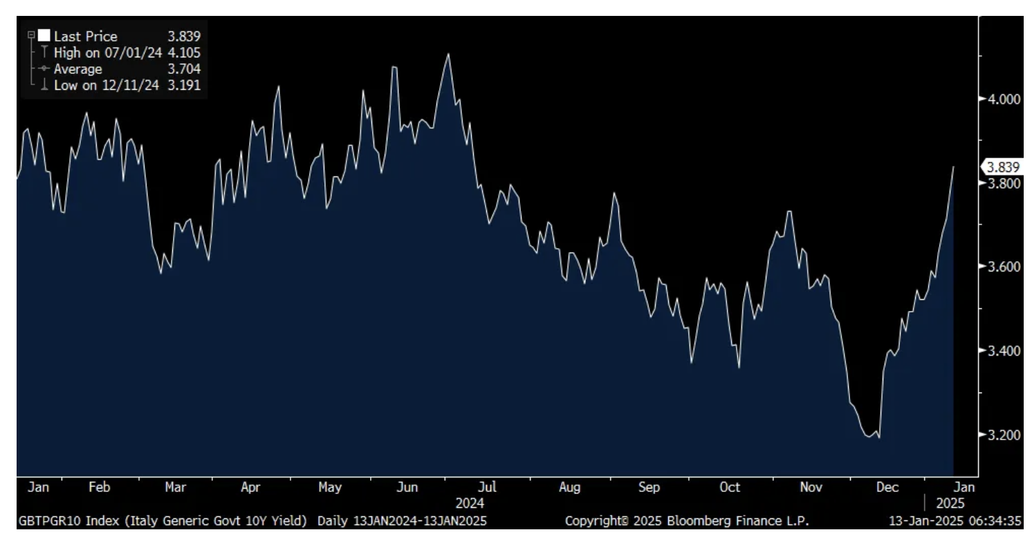 To highlight today, it is Italy's bonds which are selling off the most with its 10 yr yield up 7 bps to 3.84%, the highest level since July 2024.