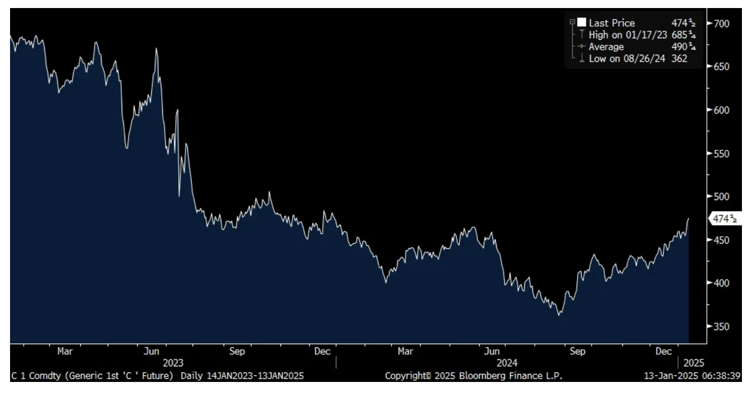 Over the last month we've seen record high prices in coffee and cocoa along with cattle too, helping to raise the price of beef. As I mentioned here just a few weeks ago, I've had my eye also on the main row crops of corn, soybeans and wheat to play catch up on the food upside. Today, corn is up 1% to the highest level since December 2023 and we continue to be long and bullish the fertilizer stocks that have been brow beaten. While corn is still well off its 2023 highs, as seen below, there is plenty of running room available.