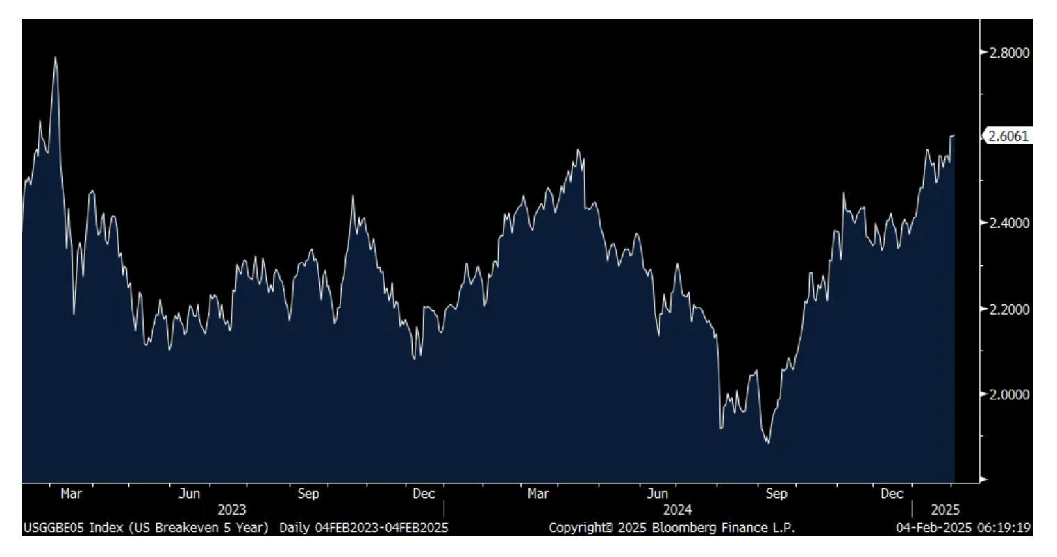 While maybe tariffs are not inflationary past the one time price set, the 2 yr inflation breakeven doesn't care as yesterday it closed at 2.98%, the highest since March 2023. The 5 yr did as well at 2.60%.