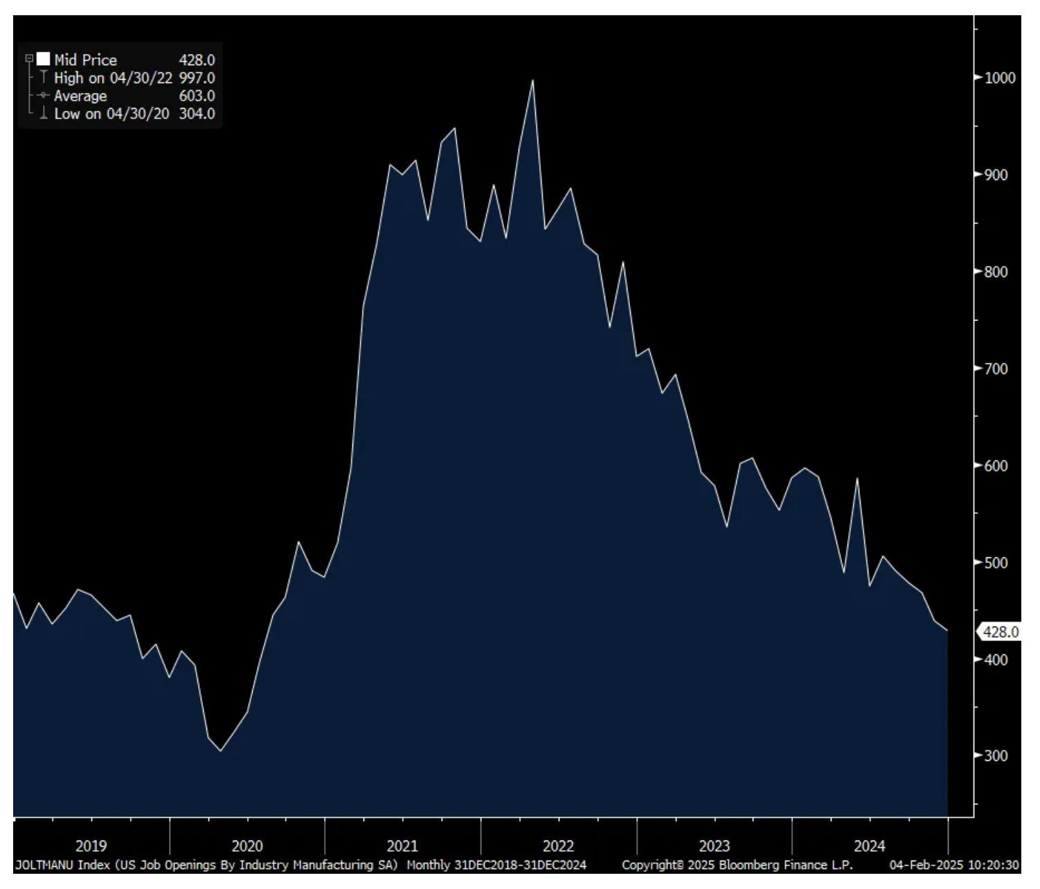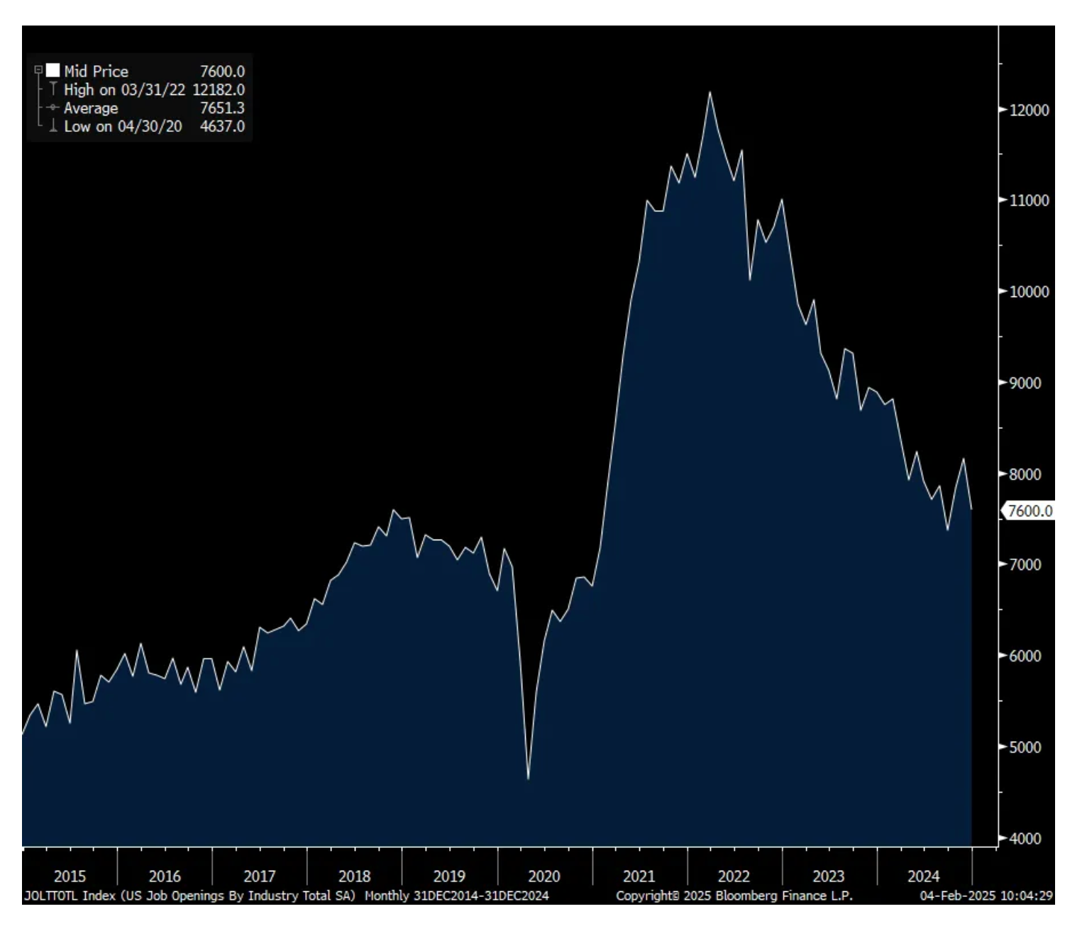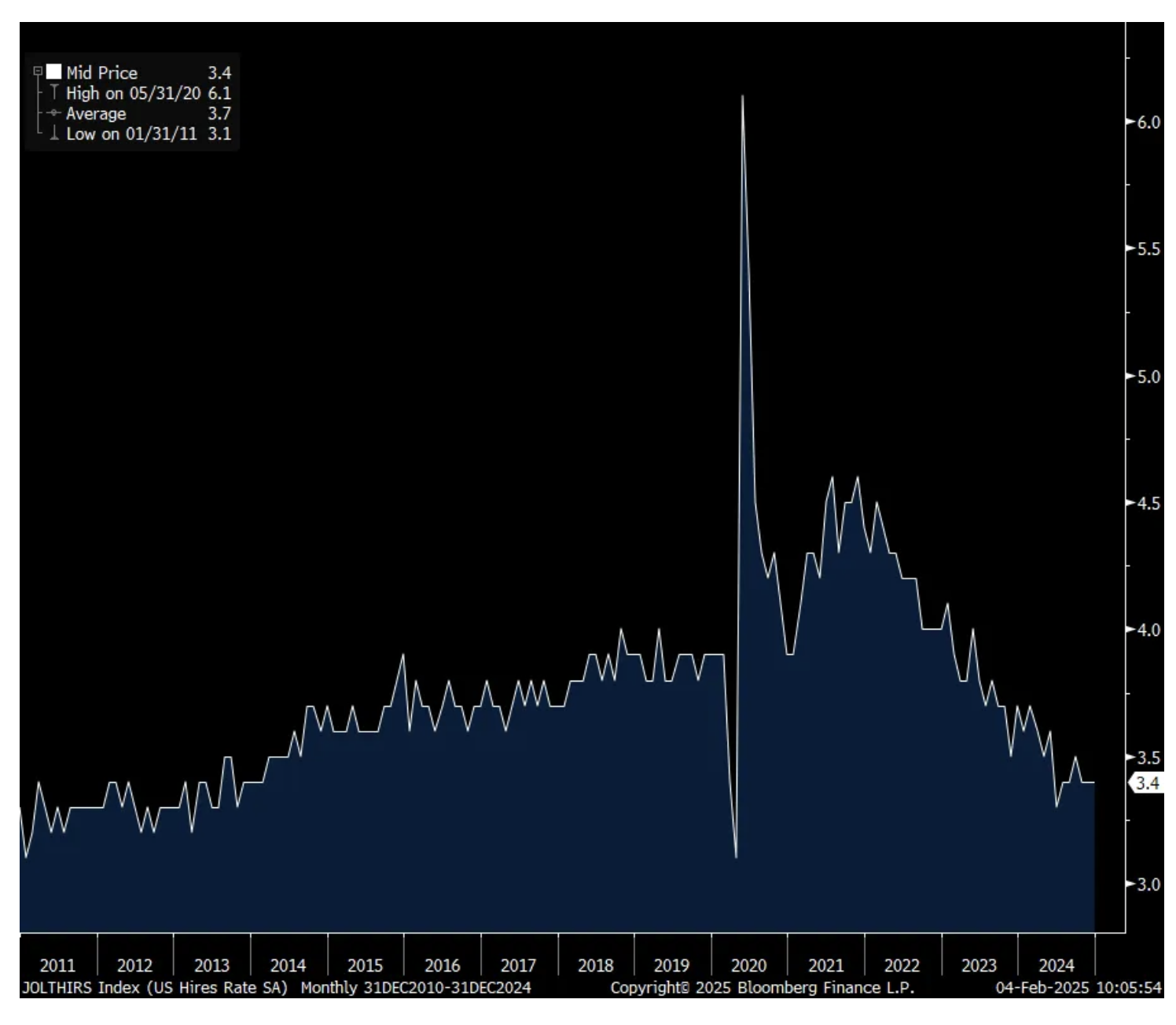 There was a notable reduction in the number of job openings in December to 7.6mm from 8.16mm in November. The estimate was 8mm. The hiring rate held at 3.4% for a 3rd straight month and one tenth off the lowest level since 2013 not including Covid. The quit rate was 2% for a 2nd month and also one tenth off the recent lows.