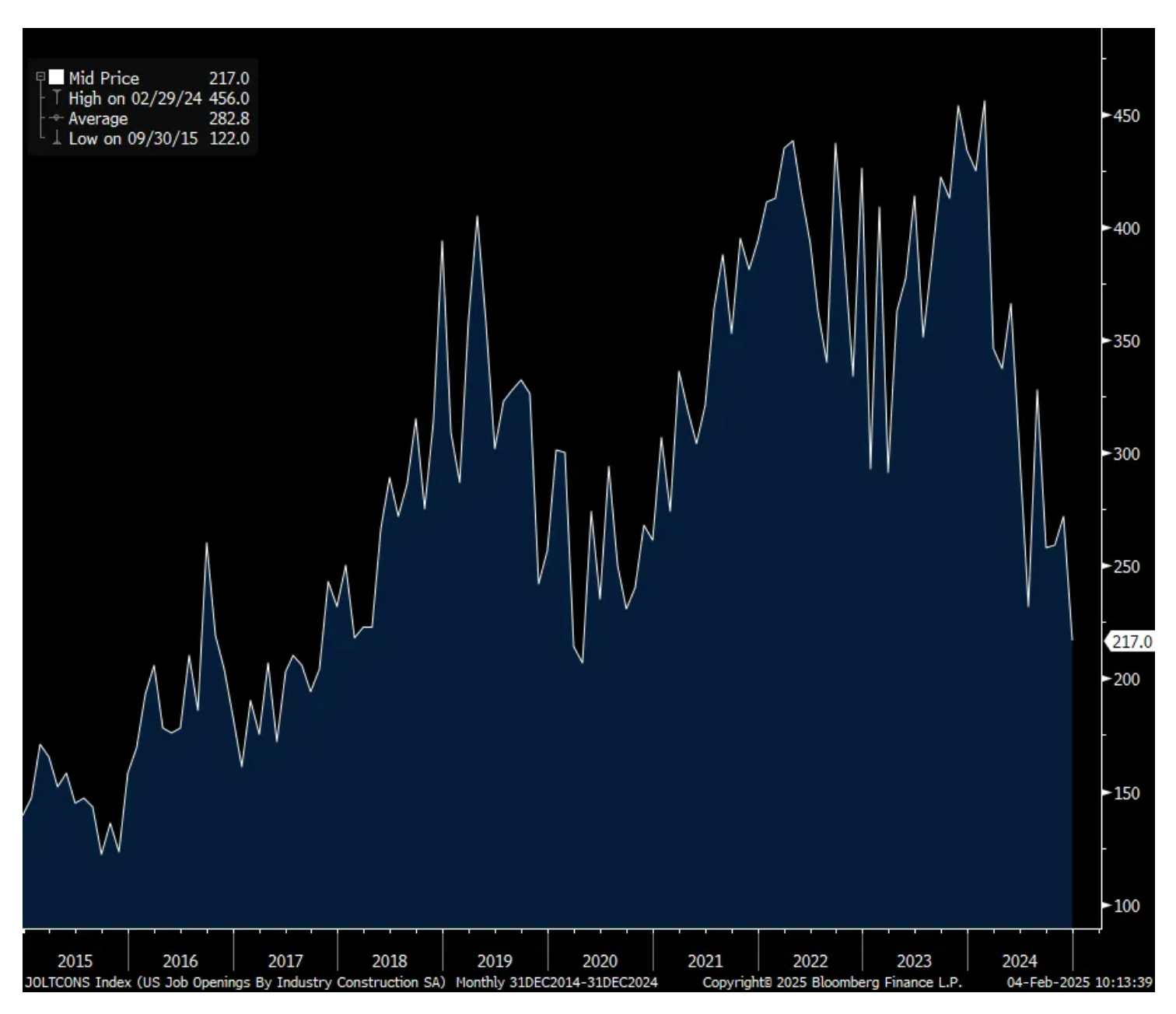 Bottom line, this data point squares with the slowing pace of hiring, though still good relative to the growth in the labor force. The service sector continues to carry the weight though as seen by the multi year low in job openings for construction and manufacturing workers.