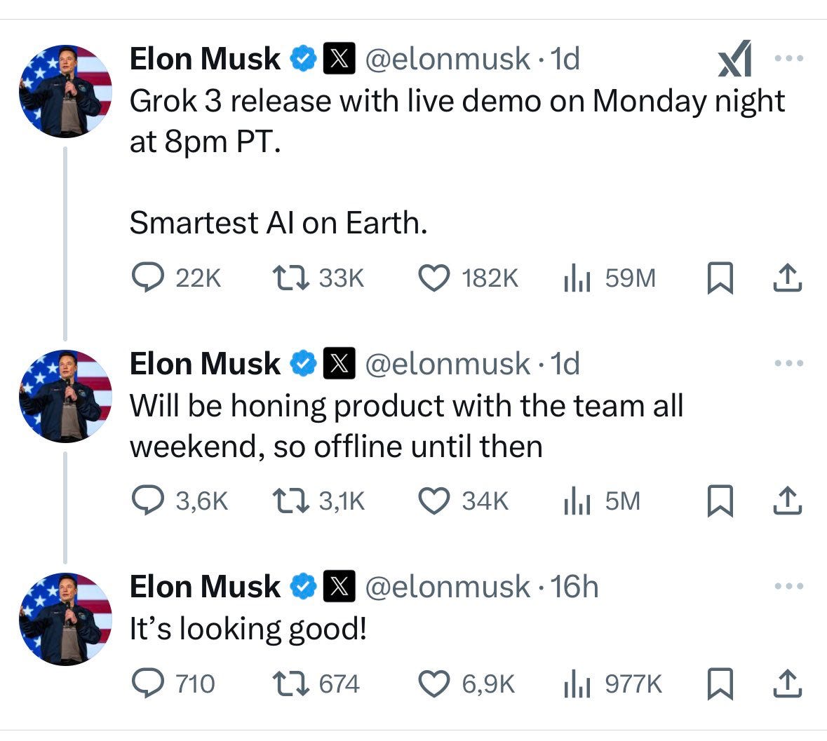 Spoiler alert: it wasn’t. Musk and 3 people from his company just demo’d Grok 3 tonight, live, and to anybody who has watched these systems lately, the demo just looked like a formulaic carbon copy of many other demos: some slightly better than before results on benchmarks, a lot more training (apparently 15x the compute used for Grok 2), demos of automatic coding of a variation on Tetris that didn’t quite seem to work, and a new product called, rather derivatively, “Deep Search” which sounds just like “Deep Research”. For good measure there was a new entrant in the test-time-compute genre with o1, o3, r1 and many more. I didn’t notice anything truly original.