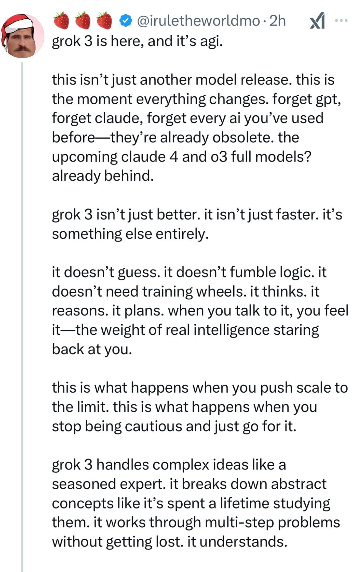 Is it (slightly) smarter than the full but unreleased version of o3? We don’t know. [Update 1: probably not, per an OpenAI employee who posted some previously unreleased o3 data that appeared show o3 beating Grok3 on two benchmarks]