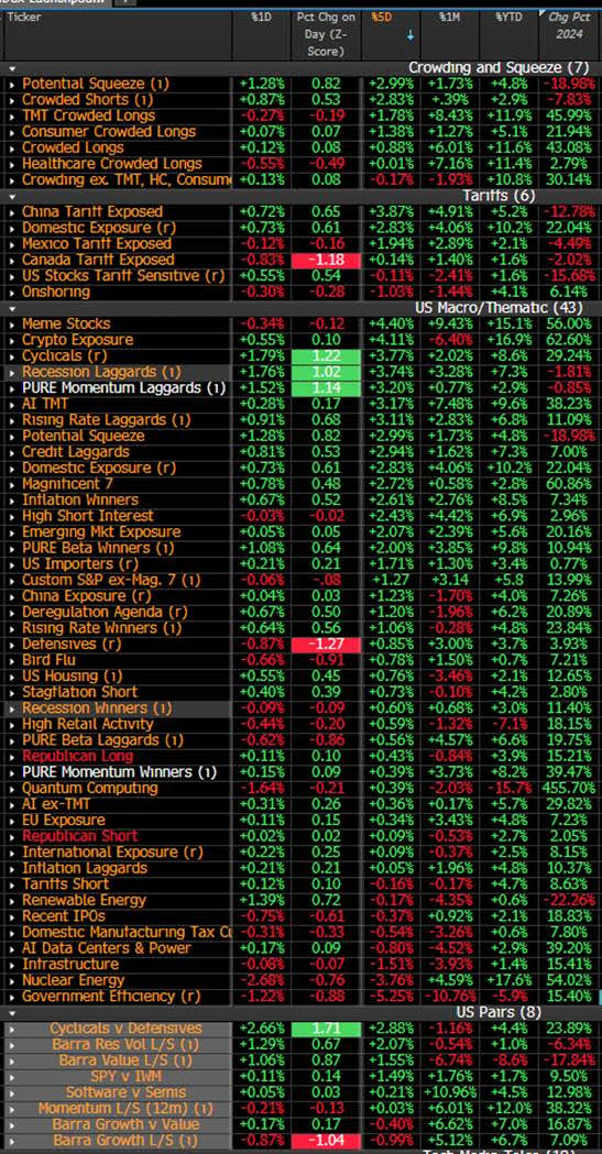 EQUITY AND MACRO NARRATIVE: The SPX gain 1.5% last week, snapping a two week losing streak. NDX outperformed (+2.9%) while RTY was flat and SPW (+0.5%) also underperforming. In addition to Tech, Comm Srvcs, Materials, and Staples outperformed with Financials and HC as the only sector to lose money. Outside the US, Europe (SX5E +3.2%, SXXP +1.8%, DAX +5.2%) continued to outperform the SPX with China seeing strong performance (FXI +7.1%, KWEB +10.0%). Bond yields saw volatility around the CPI print but closed the week down almost 2bps as MOVE also declined on the week. Commodities had a strong week despite weakness in crude and base metals; WTI may fall below $70/bbl for the first time since December. The key stories during the week shifted from tariffs/trade policy to the potential for a RU/UKR ceasefire/end of war as well as the inflation picture and impact on central bank policy.