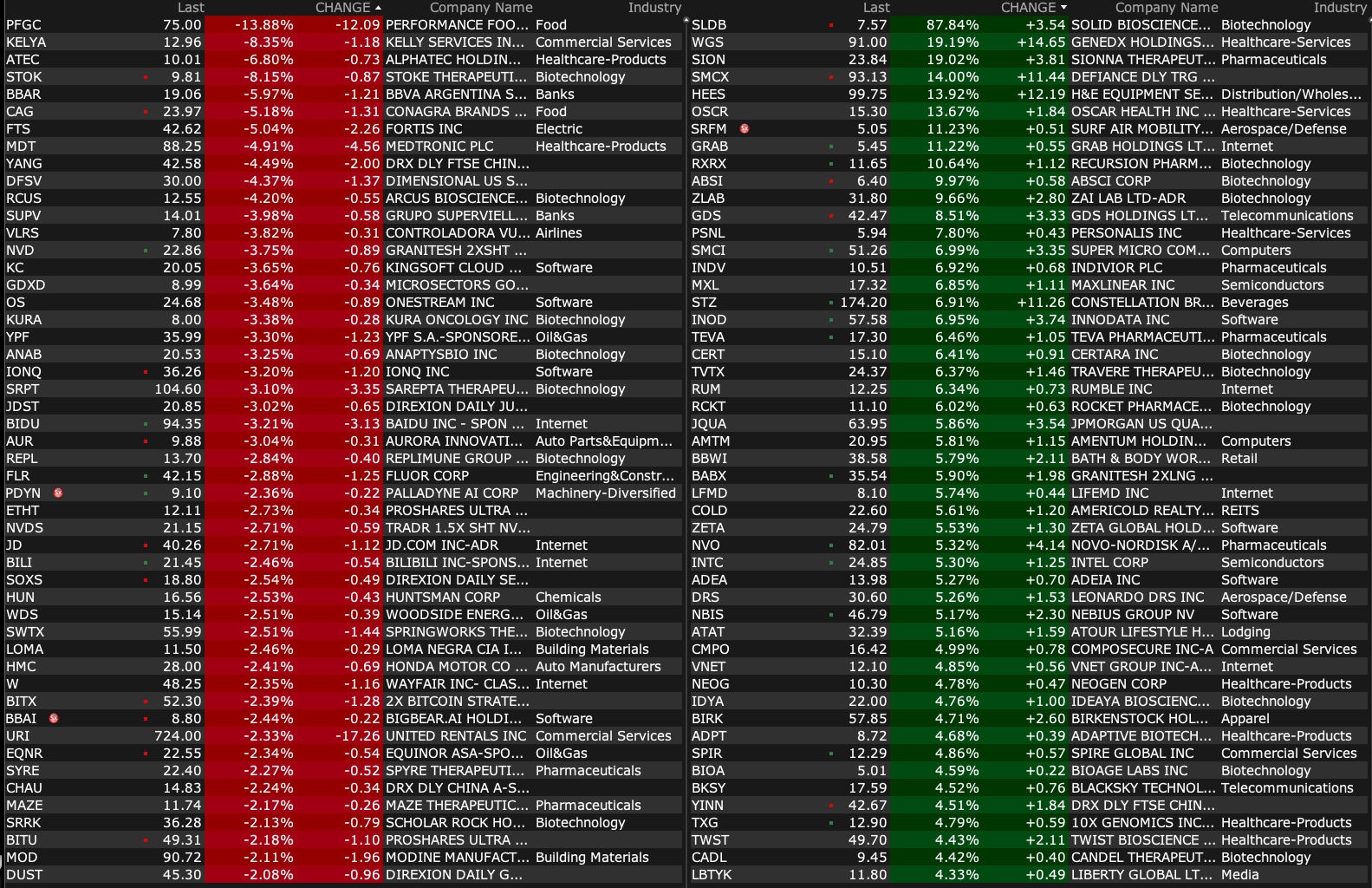 -SLDB +74% (reports positive initial clinical data from Next-Generation Duchenne Gene Therapy Candidate SGT-003; Expects to dose ~20 total participants by 4Q25 and plans to request FDA meeting In mid-2025 to discuss potential accelerated approval pathway for SGT-003)