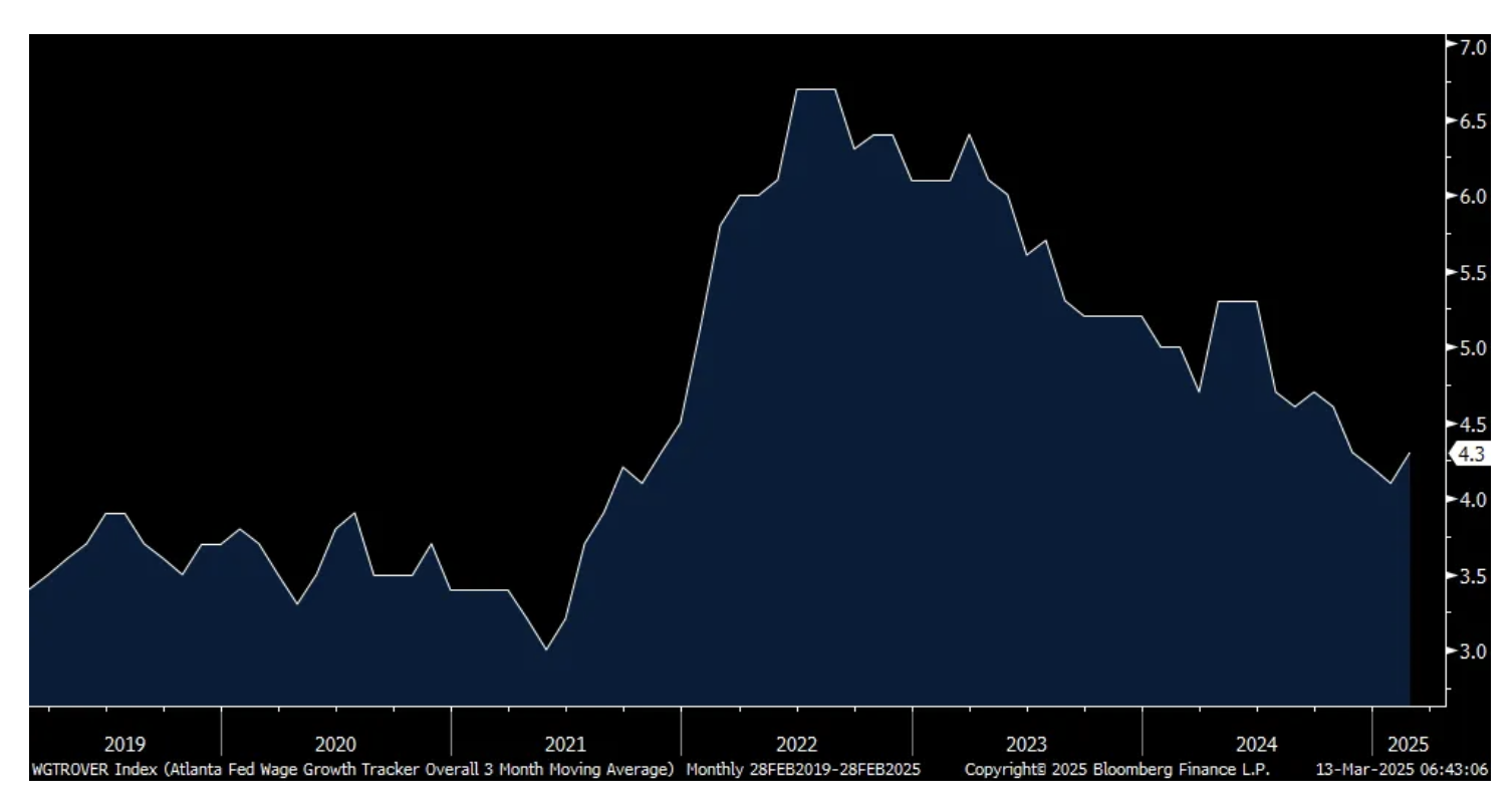Meanwhile, wage growth remains pretty good as the Atlanta Fed released its February wage growth tracker which rose 4.3% y/o/y vs 4.1% in January, 4.2% in December and 4.3% in November. For a 'job switcher', wages were higher by 4.8%, the same pace seen in January. For a 'job stayer', they accelerated to 4.4% growth vs 4.1% in the three prior months.