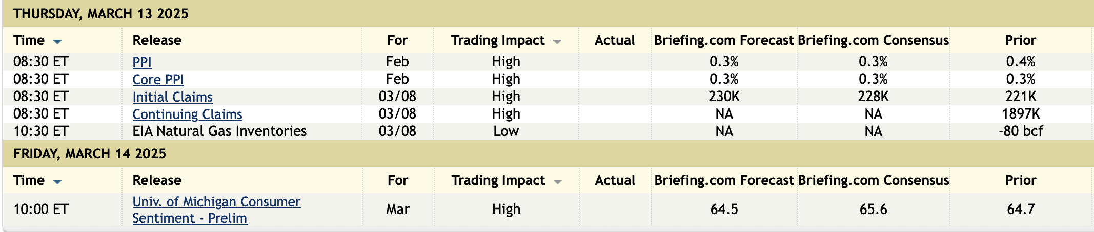 The February PPI was unchanged. That was well below the estimate of a .3% increase but mostly offset by a two tenths upward revision to January to a .6% gain from .4% initially. The core rate was lower by one tenth m/o/m vs the estimate of up .3%, partly mitigated by also a two tenths upward revision to January to up .5%. Versus last year, headline PPI is still up 3.2% y/o/y vs 3.7% in the month before. The core rate is higher by 3.4% vs 3.8% in January.