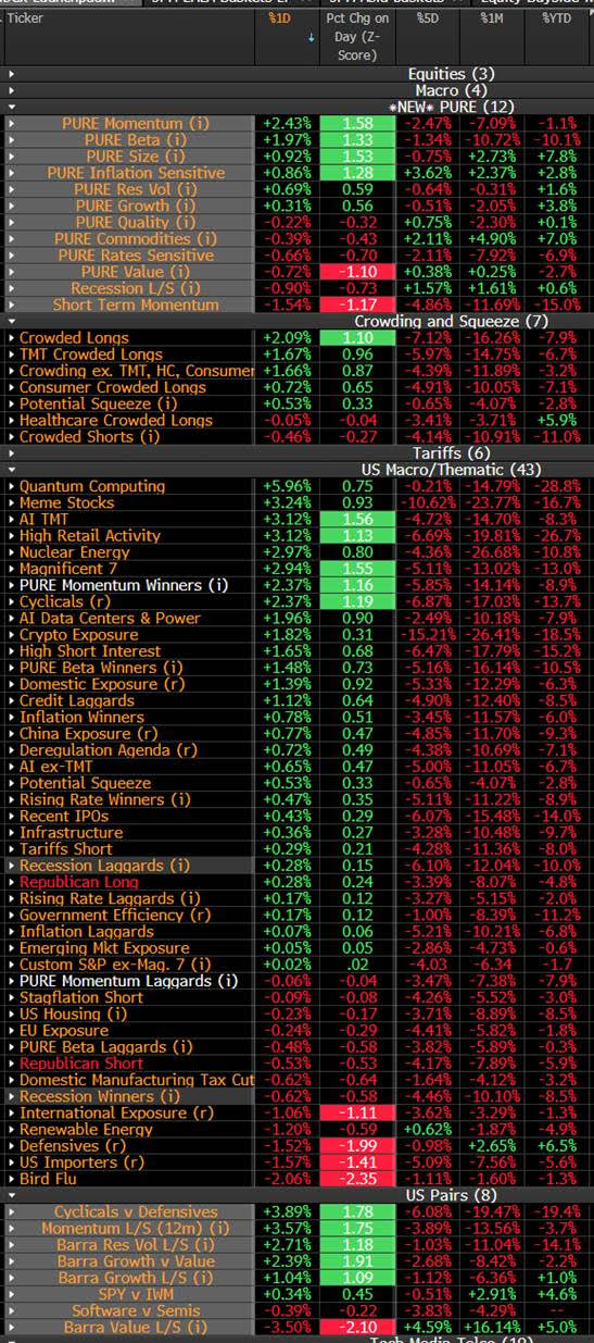 US: Stocks closed higher led by Tech. We saw a short relief rally post dovish CPI print, which helped ease some stagflation fears, but the bigger driver of this benign price action was the lack of geopolitical/tariffs headlines today. Overall, we saw the recent underperformers (cyclicals, Tech, Mag 7) staged a rally today. Thematically, Crowded Longs, AI TMT, Mag 7, and Cyclicals were the best performing baskets, while Defensives lagged.