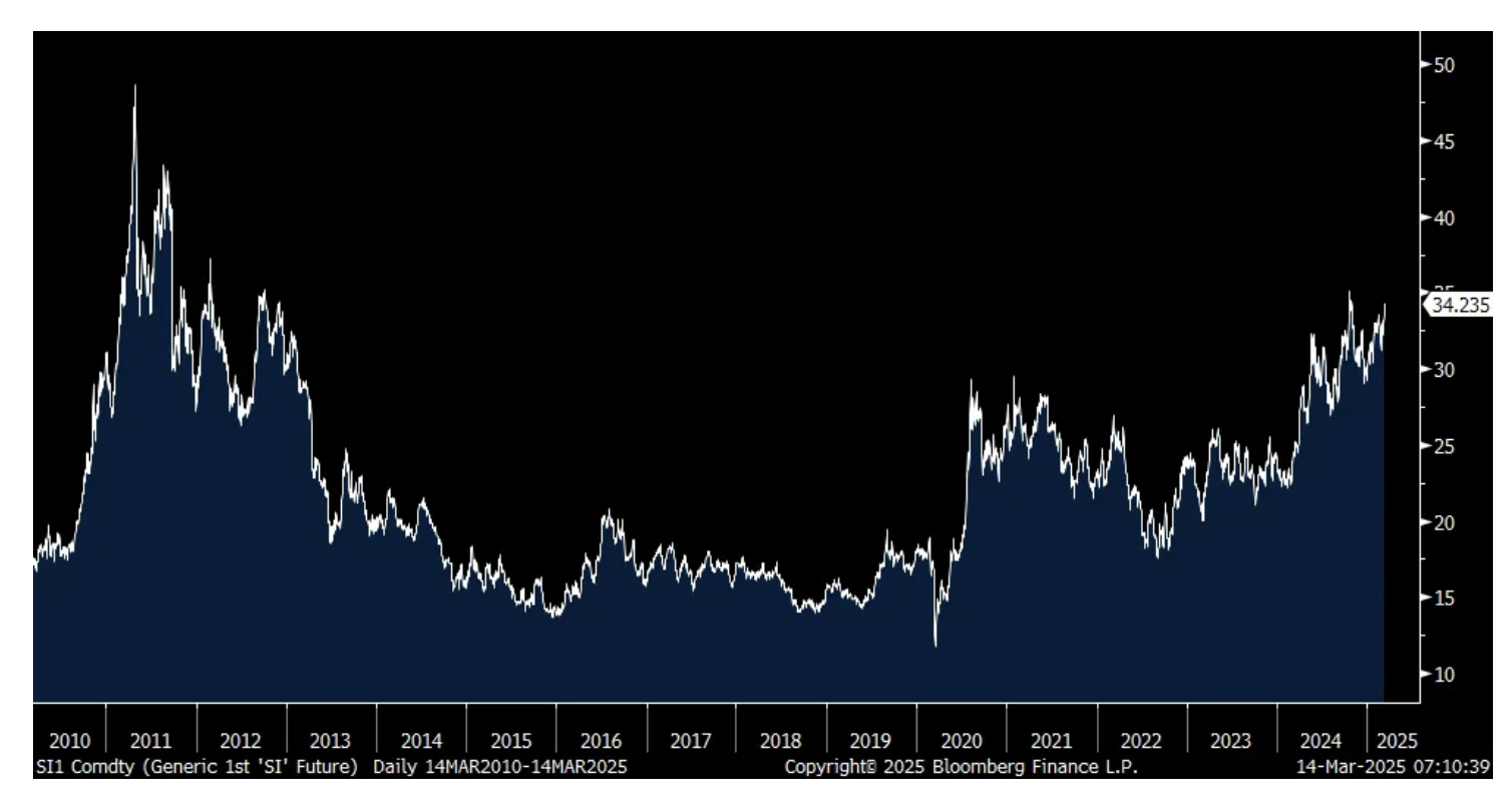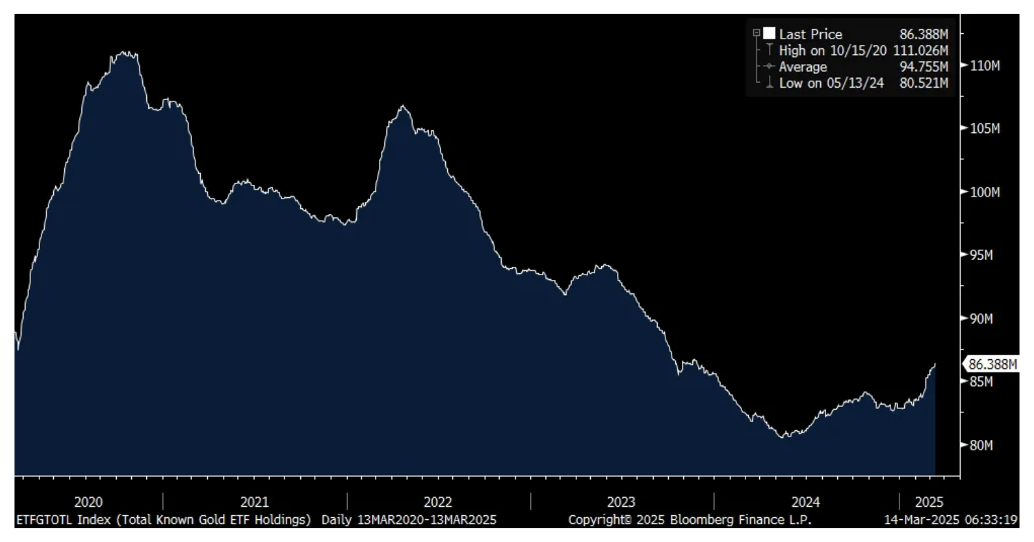 Gold has finally gotten above the $3,000 level, albeit slightly, and it's done it without much help from the western investor. I define 'help' and 'western' by looking at the ETF holdings of gold that investors usually use to own their gold, outside of physical holdings or mining stocks. At 86.4mm ounces of holdings, while off the lows of 80.5mm a year ago, is still well below the 2020 high of 110.67mm ounces. The main buying continues to be foreign central banks and governments and I'm confident that the western buyers of gold will catch up and remains sort of fresh buying powder. We remain long and bullish gold to say again. I mentioned silver the other day too and it's just $1 from the highest level since October 2012.