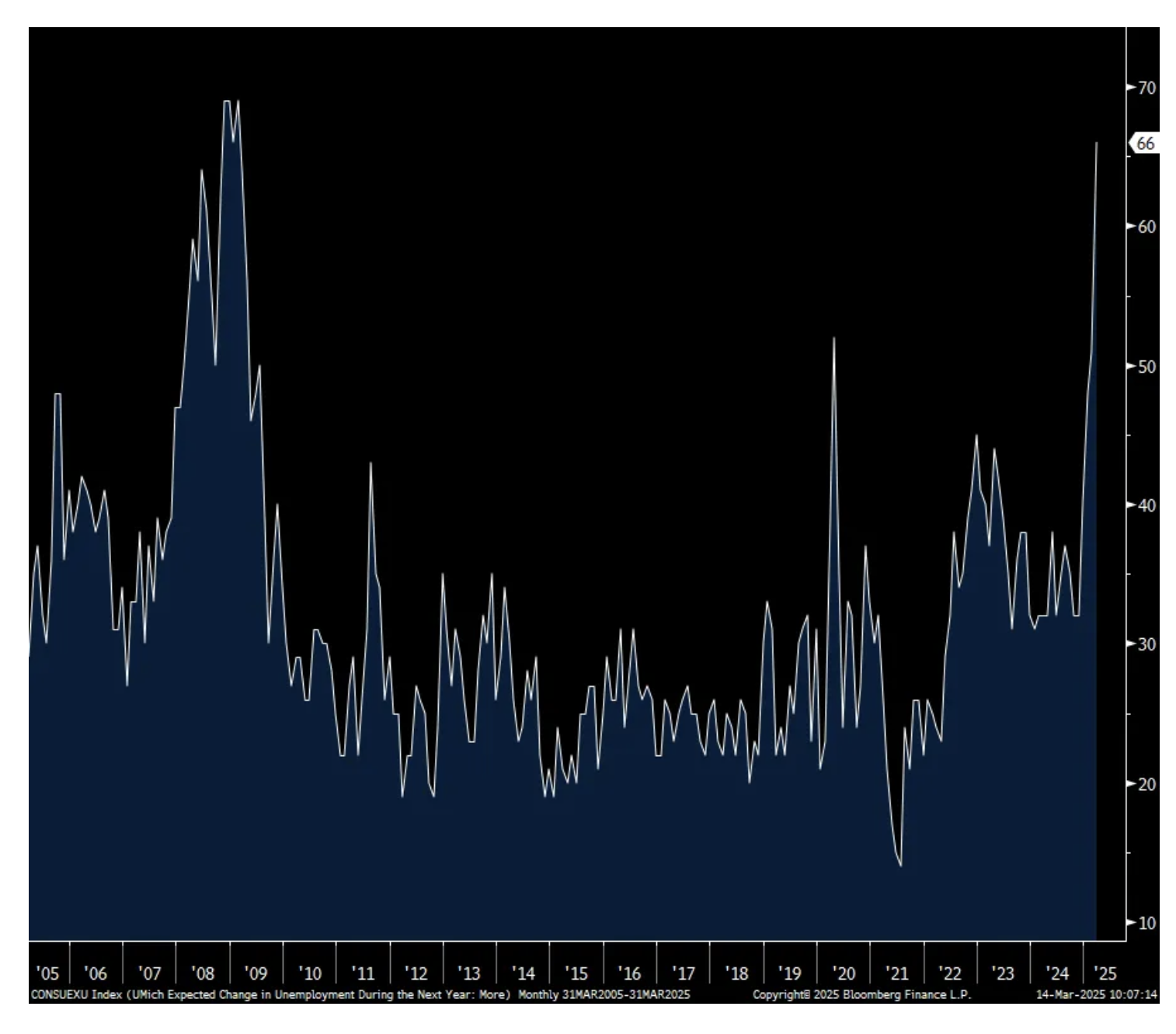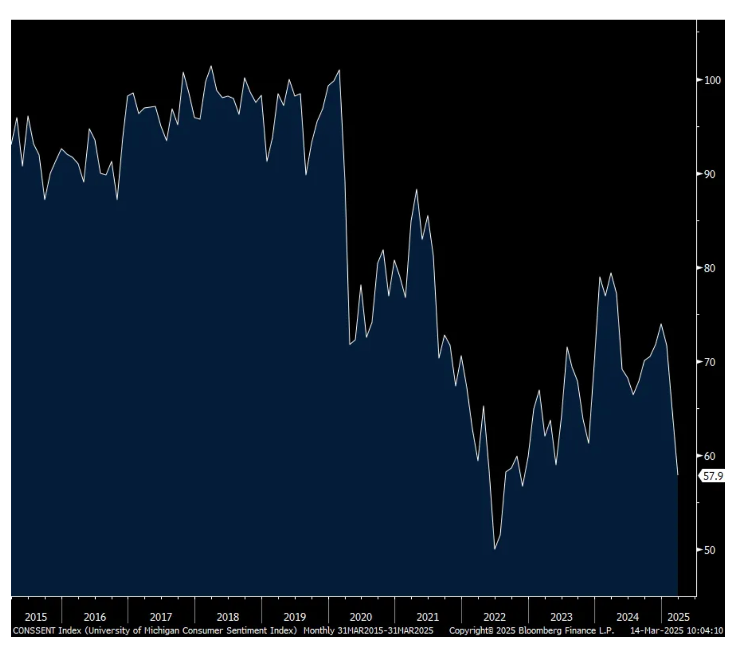 1) The very politically divided initial March UoM consumer confidence index fell to 57.9 from 64.7 and that was below the estimate of 63 and the weakest since November 2022. Most of the drop came from the Expectations component which declined by 10 pts m/o/m. The Current Conditions index was lower by a more modest 2.2 pts m/o/m. Also of note, one year inflation expectations jumped to 4.9% from 4.3% and that is the highest since November 2022. The 5-10 yr crystal ball guess went to 3.9% from 3.5%, a level last seen in early 1993. The employment component plummeted by 20 pts to just 50 with those seeing ‘more unemployment’ rising by 15 pts to 66, the most since February 2009 at the depths of the Great Recession. The income component went negative with more respondents now expecting lower income compared to those seeing more. The percentage of those expecting that family income will exceed inflation over the coming 5 years fell to just 25.5%, the lowest since this question was first asked in 1997. Spending intentions were mixed with the drop in mortgage rates likely helping to lift by 2 pts those that think it’s a Good Time to Buy a House but after dropping by 6 pts last month. Intentions to buy a major appliance also rose by 4 pts but declined by 20 pts in February. Vehicle intentions sunk again, by 7 pts to the lowest level since November 2022. Not surprisingly, “Many consumers cited the high level of uncertainty around policy and other economic factors.” And obviously tariffs are a big focus. “Last month, about 40% of consumers spontaneously mentioned tariffs during interviews, and this month, 48% did so. This figure includes the 44% of Independents who referenced tariffs, showing that these concerns are not limited to Democrats in opposition to Trump.”
