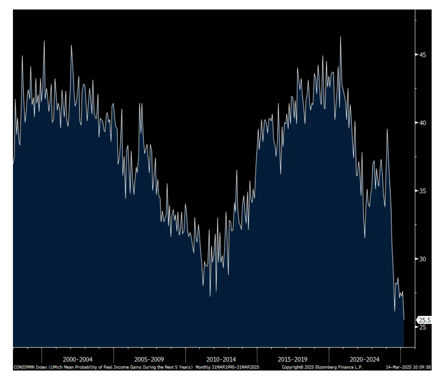 The percentage of those expecting that family income will exceed inflation over the coming 5 years fell to just 25.5%, the lowest since this question was first asked in 1997.