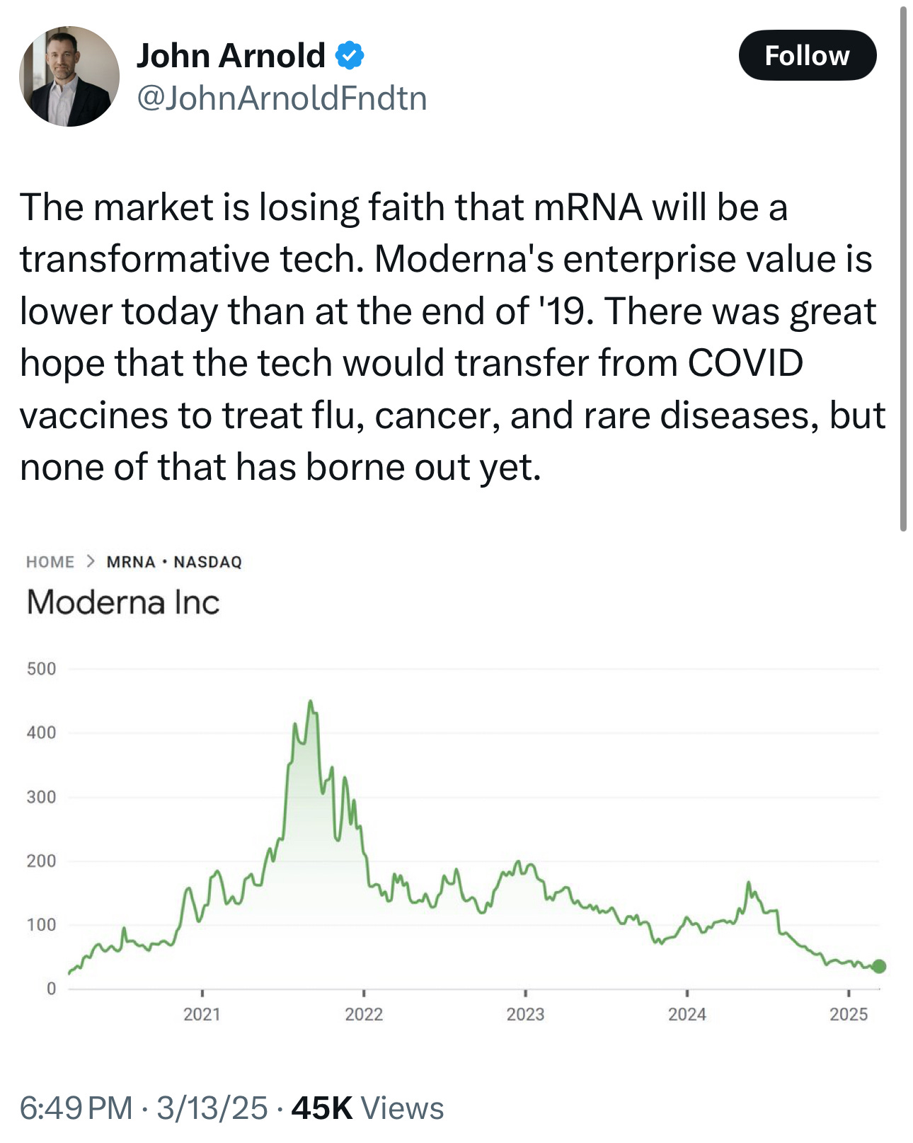 How different will artificial intelligence be? My belief is there will ultimately be more value to the AI product than the mRNA product (less than useless in my view), but at the same time more value will be destroyed due to the greater amount of excess capital that has been committed too early to the AI space (when the tech wasn’t there) than to the mRNA space, where substantially less capital was committed (although still a lot in absolute terms just relatively dwarfed by what has gone on in AI).