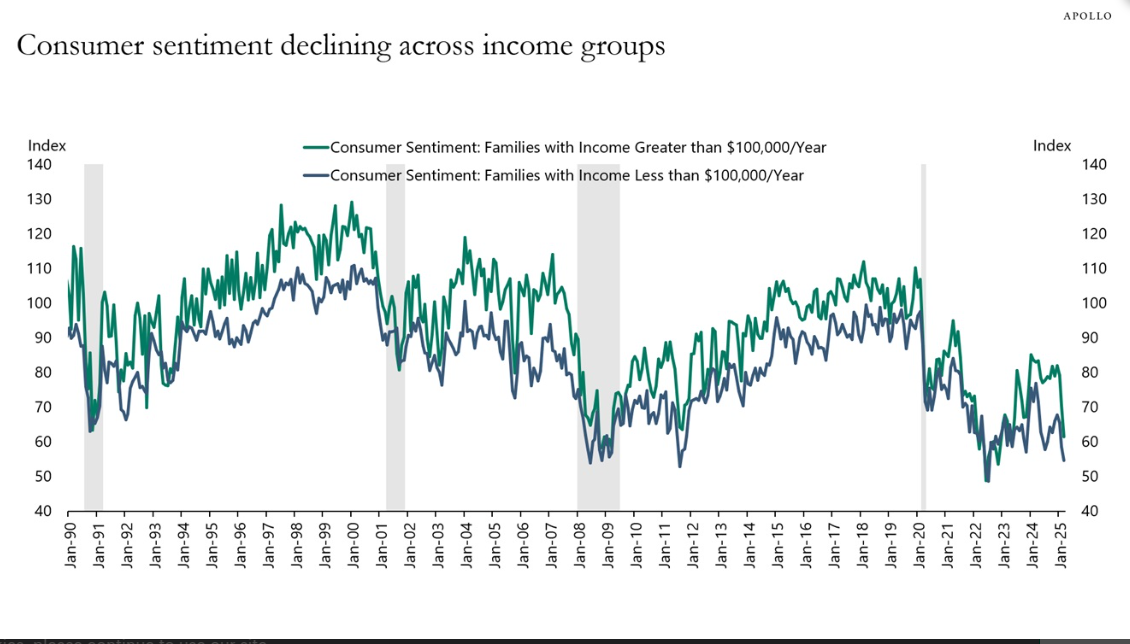 The WSJ reports that U.S. consumer spending is declining across all income levels. Wage growth is also slowing across all income groups. The article says its not all about tariffs, but rather a broader sense of uncertainty as many have less hard cash on hand. Checking and savings deposits across all income levels have declined over the 12-month period through February and are getting closer to inflation-adjusted 2019 levels. Wage growth for all income groups has slowed over the past year, and inflation adjusted debt balances are starting to surpass pre-pandemic levels.