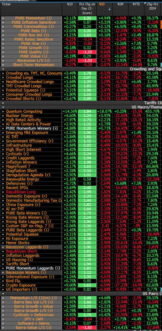 EQUITY AND MACRO NARRATIVE: Last week, the SPX fell 2.3% its fourth consecutive weekly loss and the index sits 7.8% below its all-time highs. NDX underperformed on the week, dragged by Mag7, though Semis outperformed as did the RTY. The 10Y yield moved up 1bps with DXY flat. Commodities added 11bps and marks the 5th weekly gain out of the last 6 weeks, adding 2.7% to the BCOM Index. The drivers continue to be a combination of positioning, including factor unwinds, trade and economic uncertainty, valuation, and a broadening of the rally to international Equities. Also, given the absence of both a Trump Put and a Fed Put, markets have declined very rapidly stoking hopes for an equally aggressive bounce.