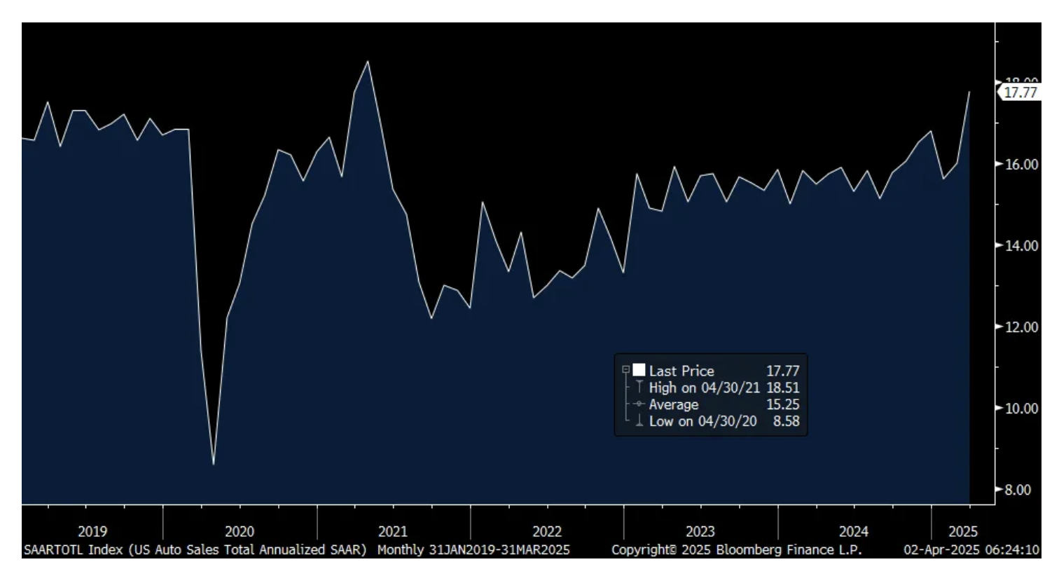 Reflecting the desire to buy a new car now as to avoid the inevitable price increase (whether on imports or a domestically made vehicle that imports their parts), vehicle sales in March jumped to 17.77mm at a seasonally adjusted annualized rate. That was well above the estimate of 16.2mm, vs 15.49mm in March 2024 and vs 17.5mm in March 2019.