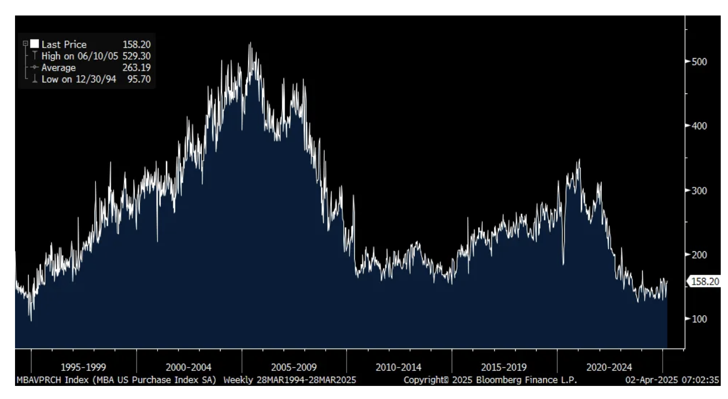 The average 30 yr mortgage rate was 6.70% for the week ended 3/28, little changed w/o/w. Purchases lifted by 1.5% but refi's fell by 5.6%, and down for a 3rd week. This is the key selling season as about half of all annual sales take place in this time frame but as seen in the chart below, purchase applications are still bouncing around 30 yr lows.