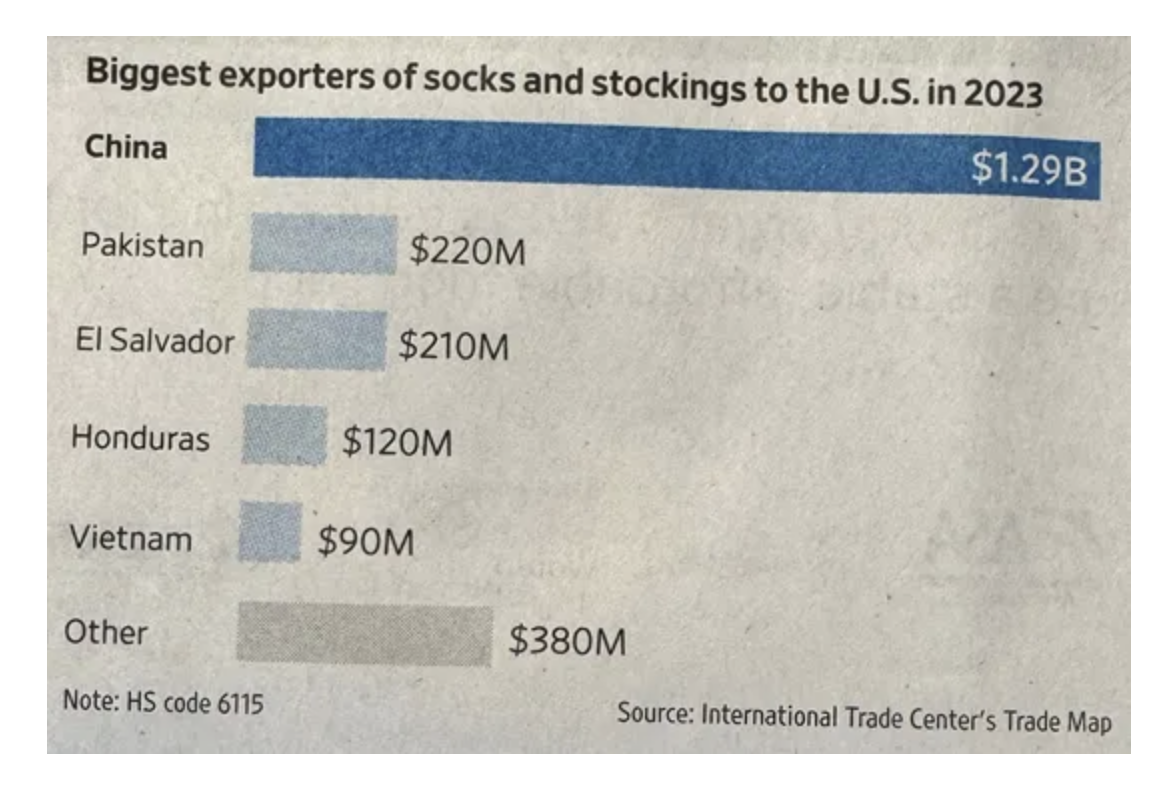 Now I'm not that familiar with the supply chains of Pakistan, El Salvador and Honduras but I'm going to guess that it will take quite some time for them to ramp up enough manufacturing capabilities to fill the gap of China, because it is quite the gap. I'd thus expect some empty store shelves of socks coming our way. Get yours while you can. (From the Wall Street Journal:)