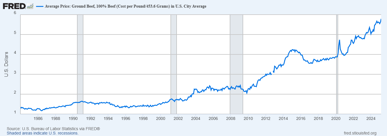 This is a chart of ground beef prices going back to 1984. They were pretty stabile over time. Over the 25 years between 1984-2009, they went from ~1.34 to ~2.15. That is a CAGR of almost exactly 2%, interestingly bang in line with the Fed's target of 2% inflation: