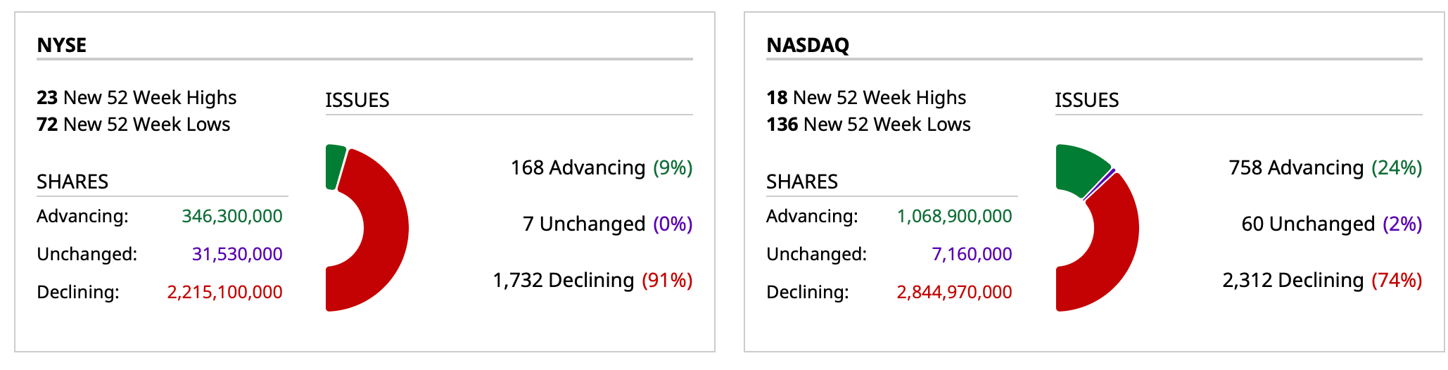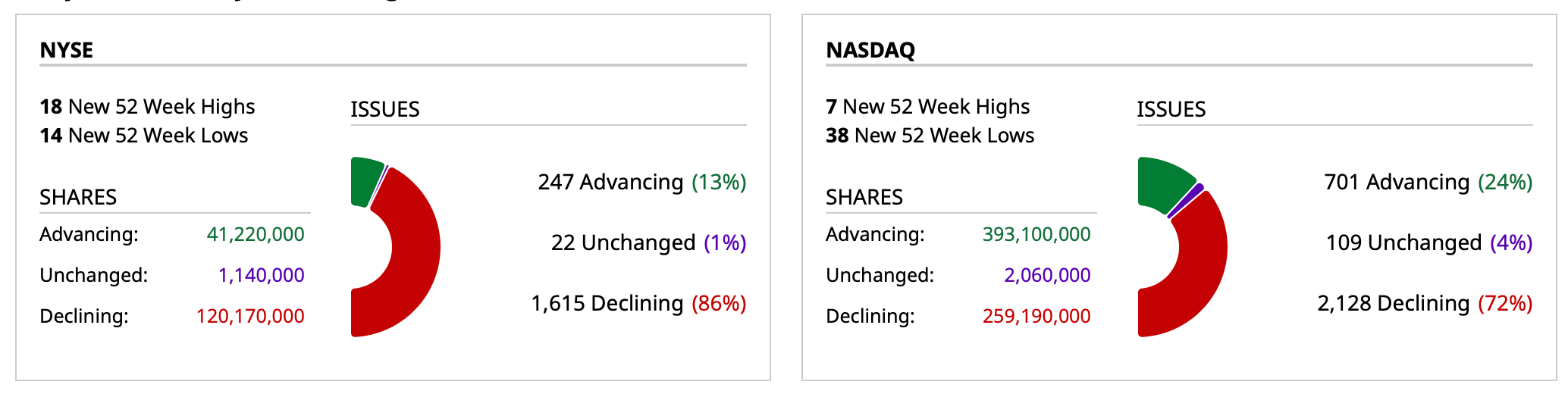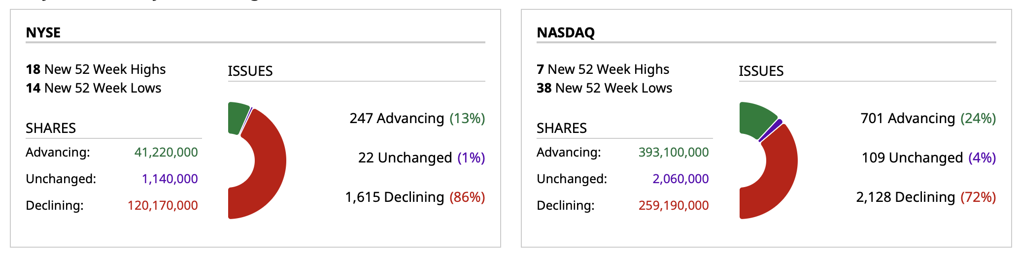 - Nasdaq volume 26% below its one-month average;