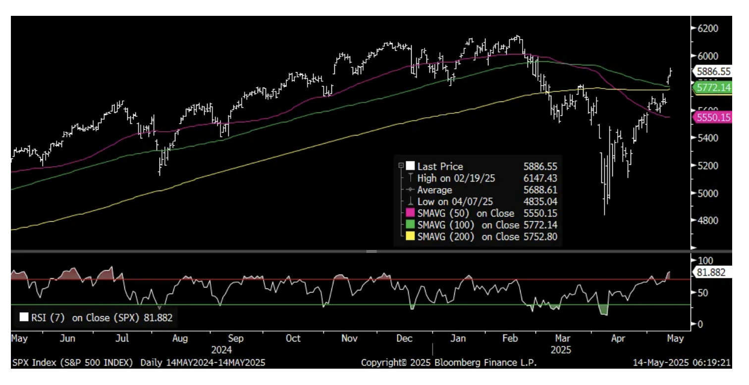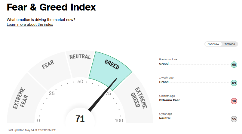 Just a technical heads up on the S&P 500, and it's only one gauge so don't look at it in isolation. The 7 day Relative Strength Index closed yesterday at the highest level since July 2024. It's been a pretty powerful rebound for sure. The CNN Fear/Greed index which bottomed at 3 in April and which can't go below zero and thus uber 'Extreme Fear', closed at 69 yesterday, nearing 'Extreme Greed.'