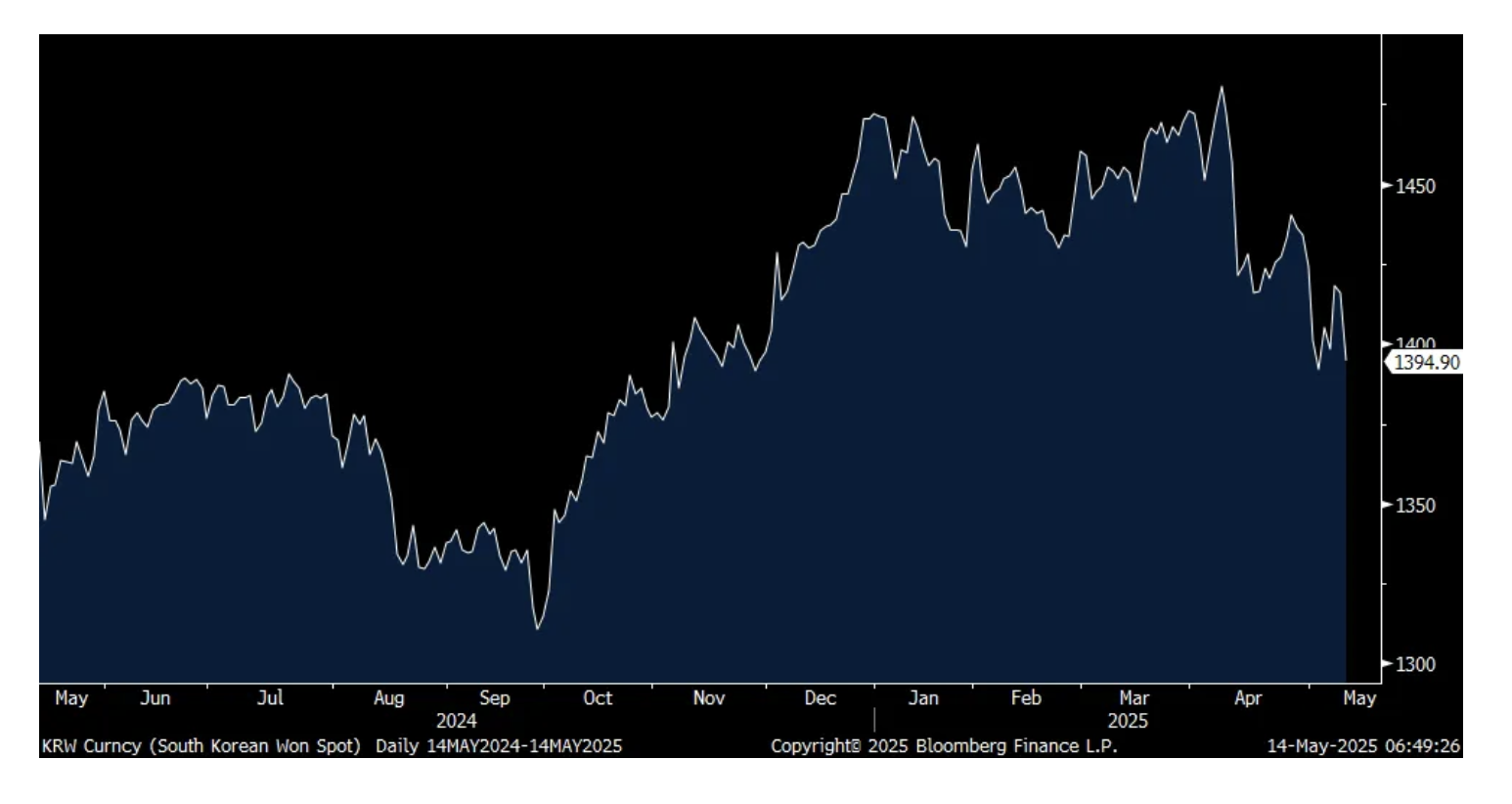 Korean Won (lower it goes, the higher its value vs USD)