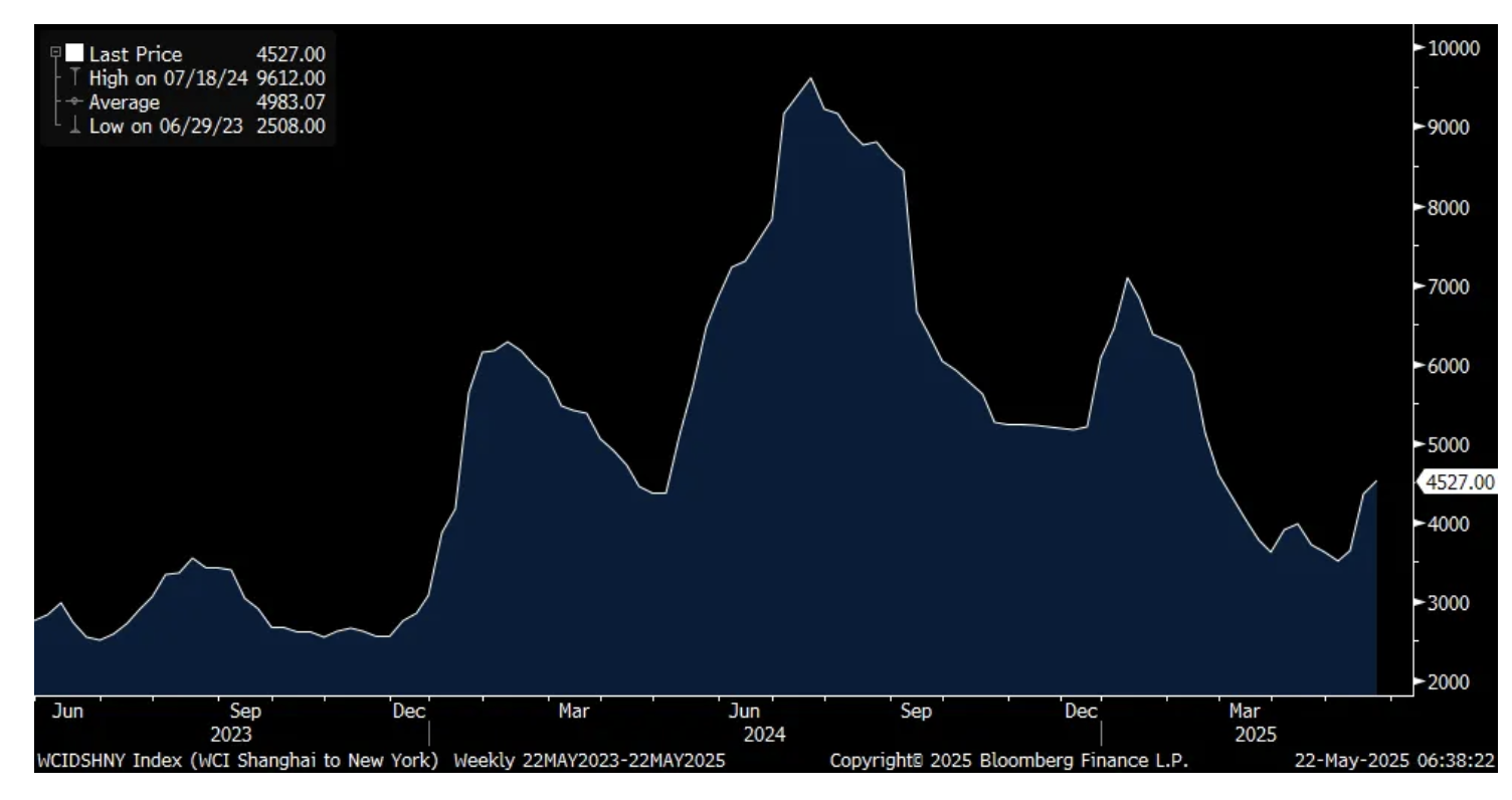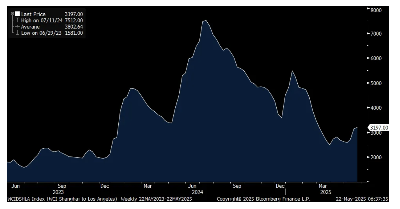 Updated container shipping prices just came out and after last week's sharp rise, they were only up modestly w/o/w. From Shanghai to LA, the price of a 40 foot container went up by $61 to $3,197. The Shanghai to NY route saw a price gain of $177 to $4,527. I'm surprised they didn't go up more which maybe implies that a 30% tariff on imported Chinese goods is still punitive.