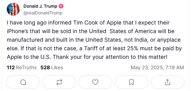 -AAPL -3.9% (US President Trump: Threatening >25% tariff on Apple unless iPhone's are built in US)
