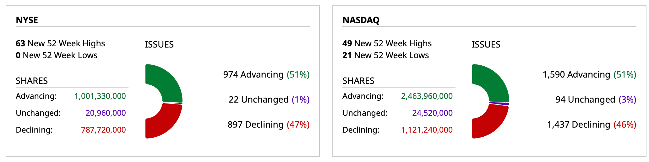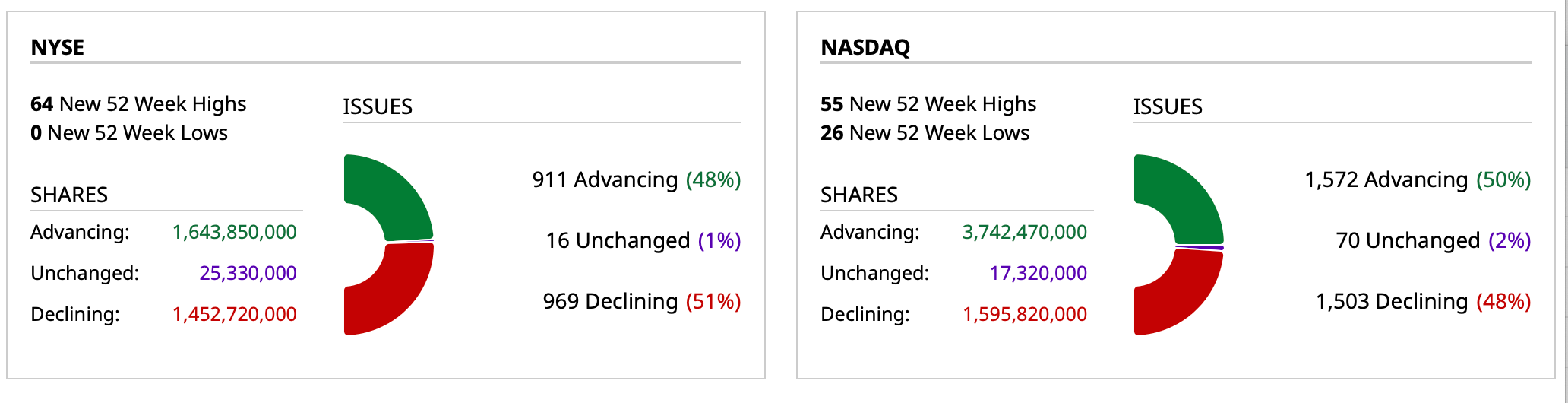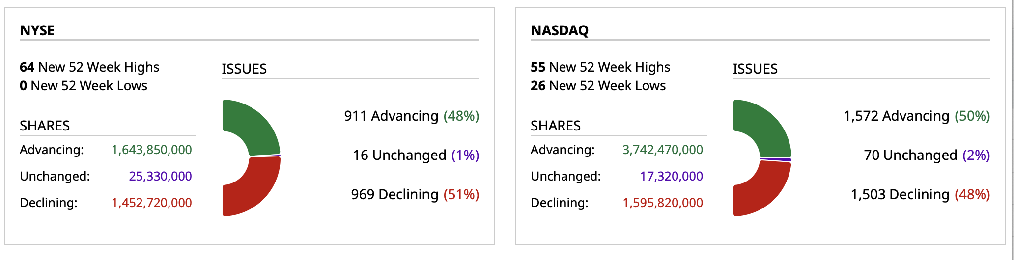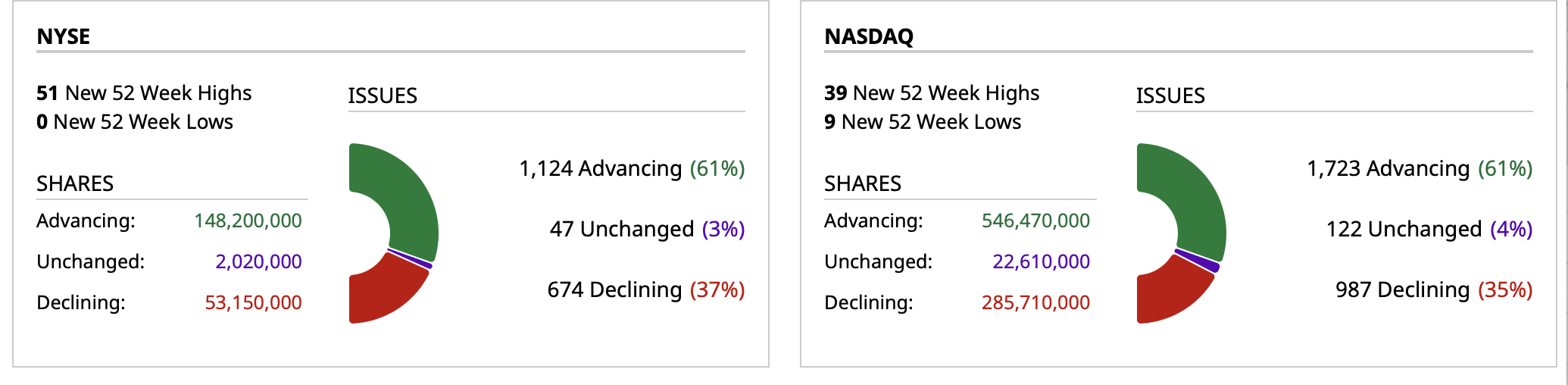 - Nasdaq volume 18% below its one-month average;