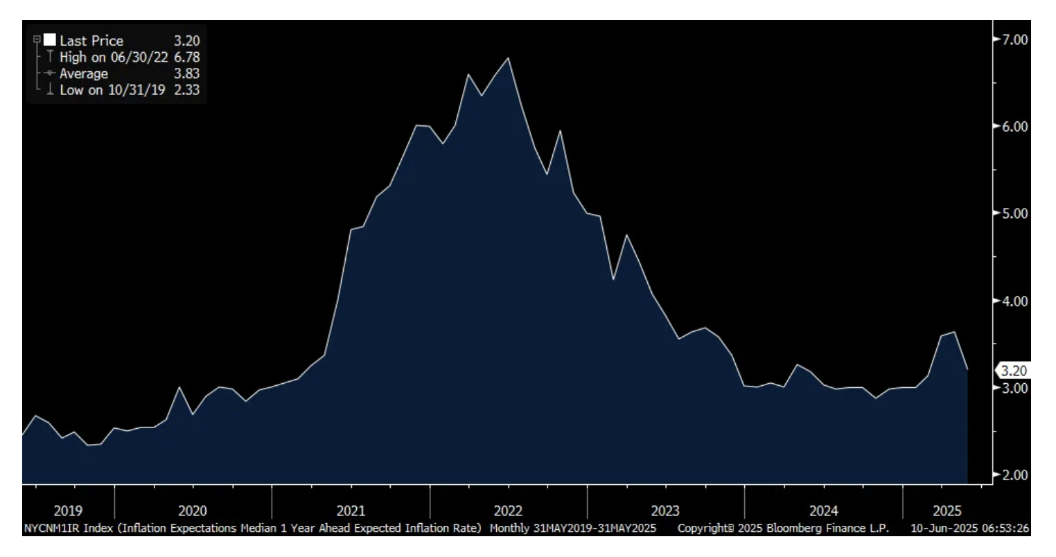 Also responding to the ratcheting down of tariff tensions with China, the NY Fed's Consumer Expectations Survey saw a drop in inflation expectations for all three time horizons. Specifically looking out one year, they fell .4 to 3.2%. This was 3% in January and jumped to 3.6% by April. For perspective, this was at 2.5% as we entered 2020.
