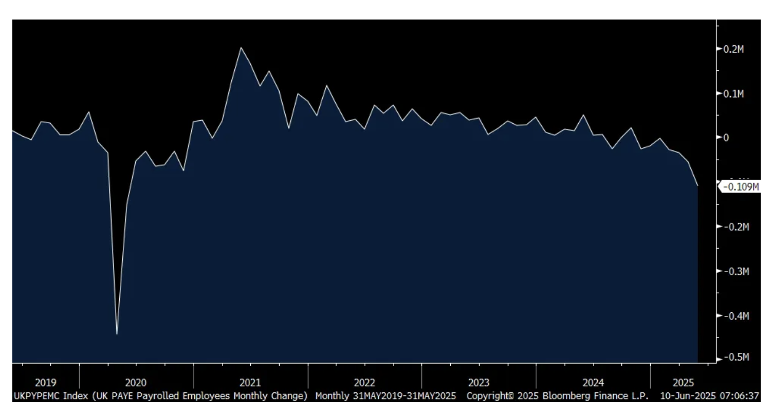The FTSE 100 is knocking on record highs and we own a few stocks that trade there as the market is cheap but their May jobs data was weaker than expected as higher payroll costs brought on by the Starmer government had its impact again. Payrolls fell by 109k, well more than the estimate of down 20k and after a drop of 55k in April, revised lower by 22k. Jobless claims rose too. Wage growth in the 3 months ended April was higher by 5.3%, still solid and well above the rate of inflation but less than forecasted. Their unemployment rate as of April rose to 4.6%, the most in 4 years.