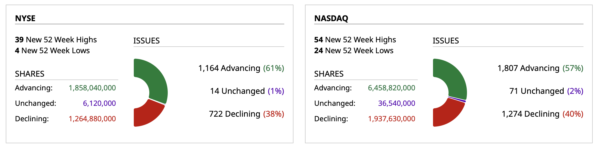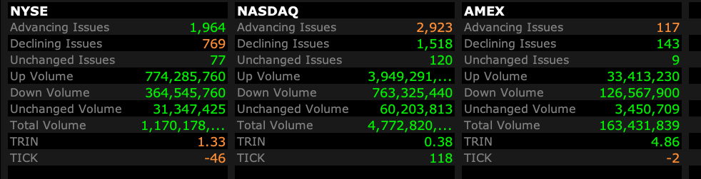 - Nasdaq volume is 33% above its one-month average;