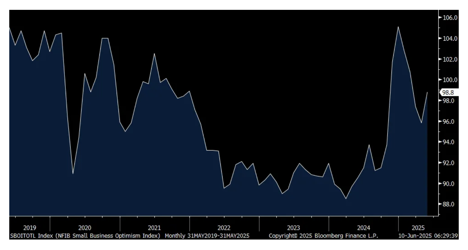 With the sharp reduction of tariff rates between the US and China off the punitive levels seen in April, and post the April 9th reciprocal tariff pause with everyone else, the May NFIB Small Business Optimism index rebounded by 3 pts to 98.8 after four months of declines.
