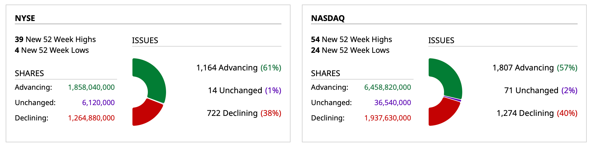 - NYSE volume is 6% below its one-month average;