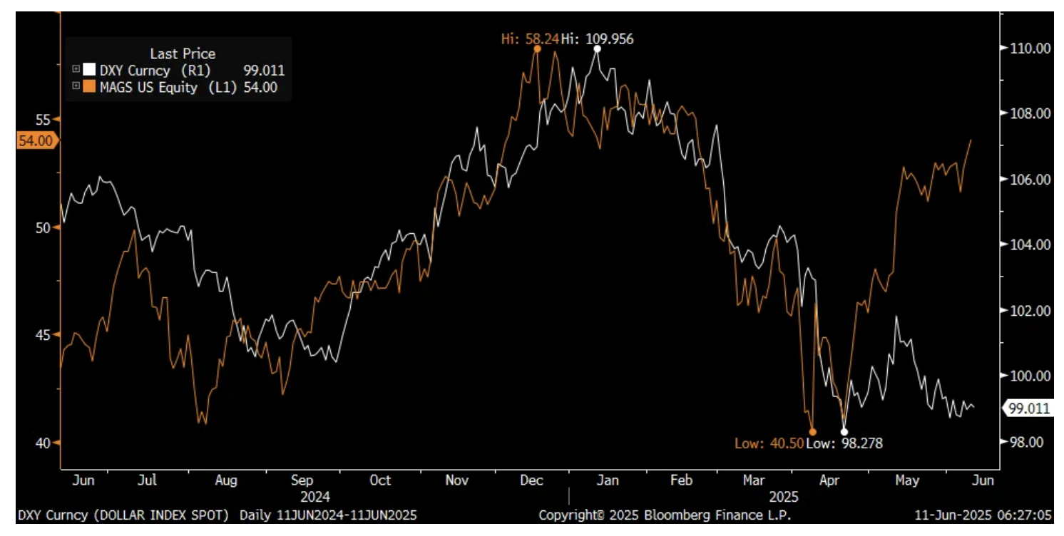 MAGS etf in orange, DXY in white