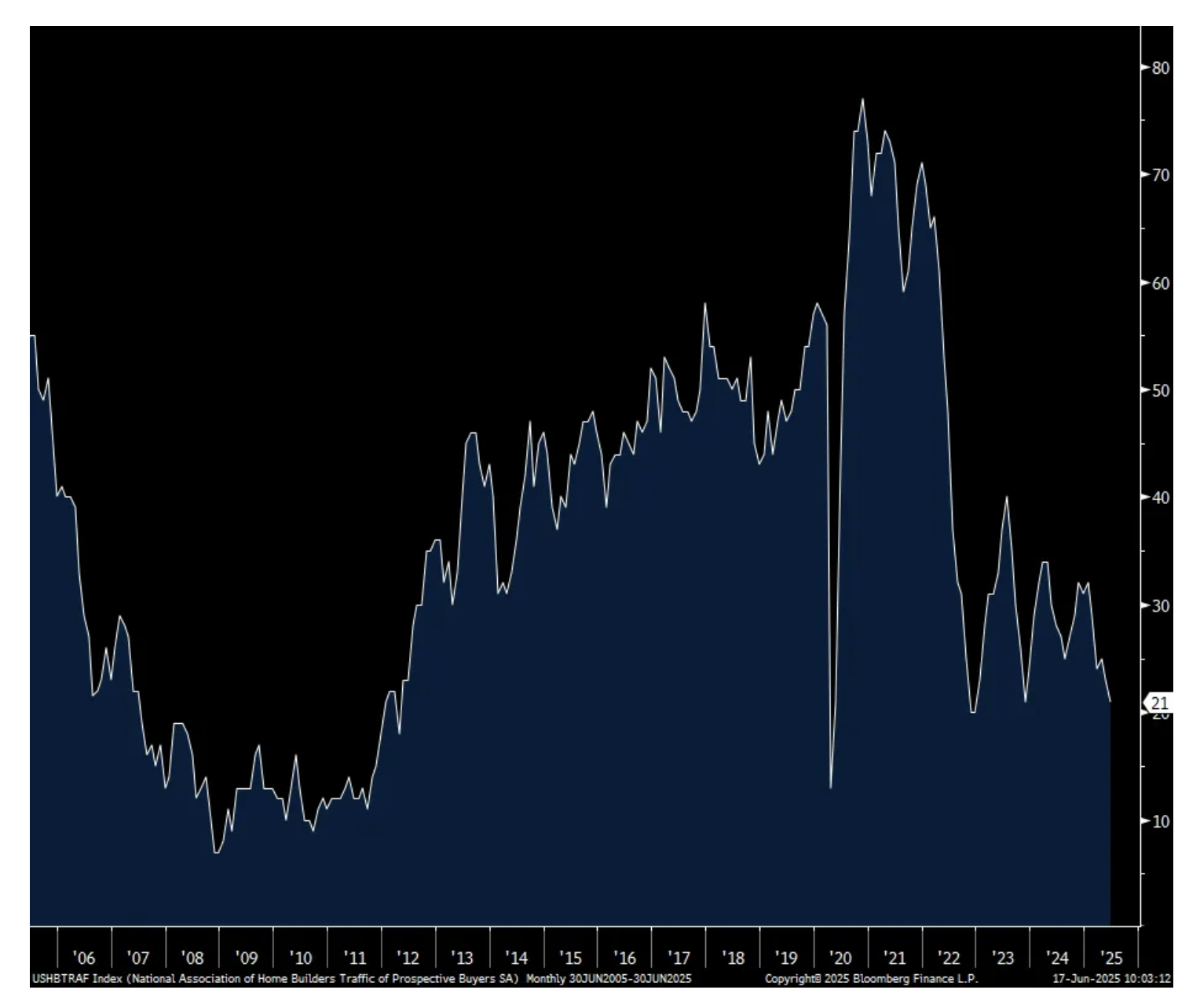 The mood of homebuilders in June remained dour with the NAHB builder sentiment index falling further to just 32 from 34 in May and vs. the estimate of 36. That’s the lowest since December 2022. Both the Present and Future components were down by 2 pts m/o/m while Prospective Buyers Traffic fell to just 21, also down 2 pts. Again, 50 is the breakeven between expansion and contraction.