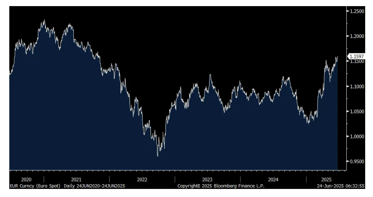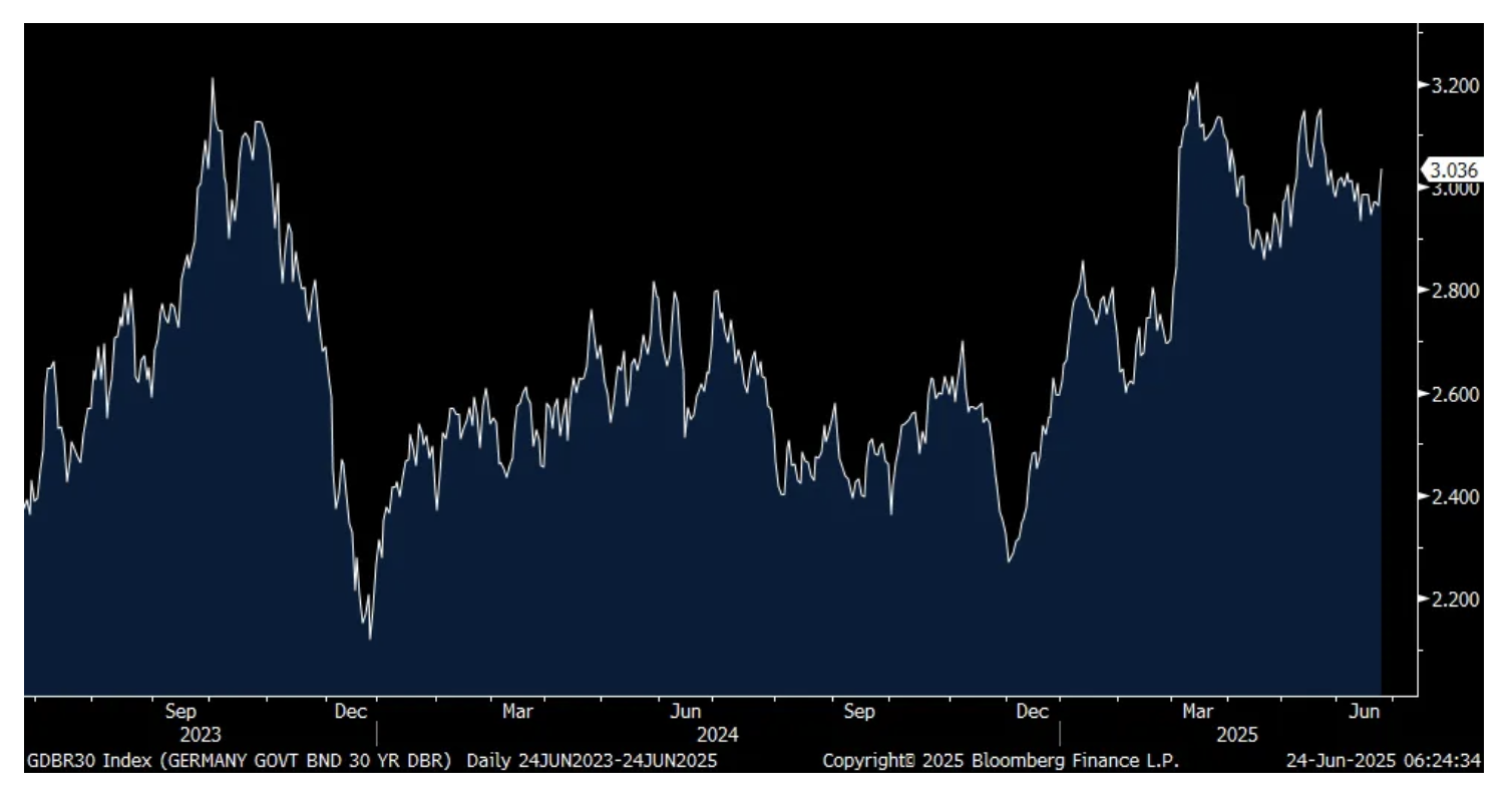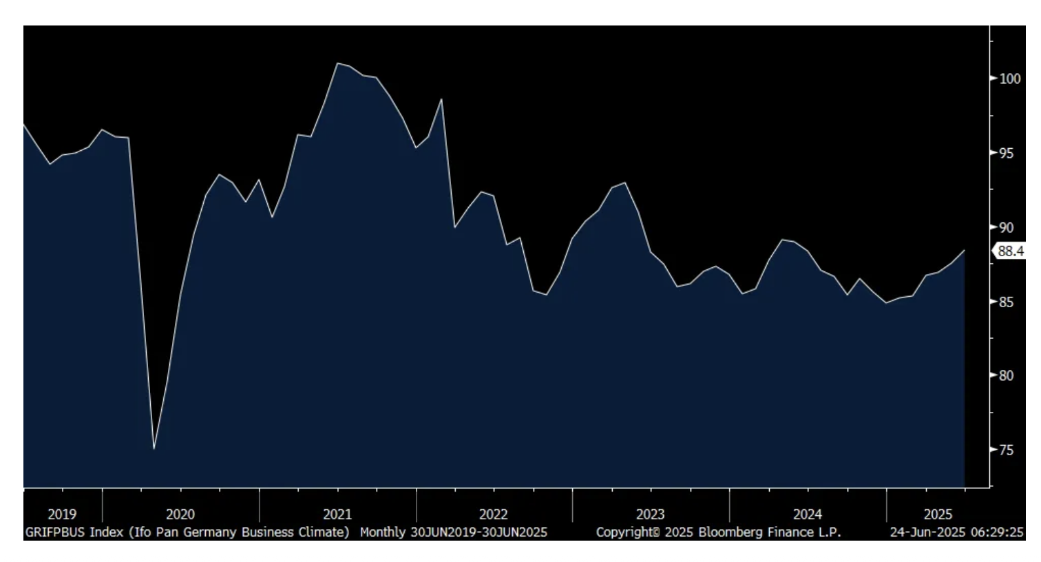 US: Futs are higher as part of a global risk-on trade. Trump announced a ceasefire between Israel and Iran after Iran’s retaliation completed. WTI has fallen 15% from Monday’s intraday high and risk assets have resumed their rally; oil shrugged off reports of Iran firing a missile to resume its move lower. Adding fuel to the rally is Fedspeak on rate cuts as soon as July; Powell testifies at 10am, day 1 of 2. Pre-mkt, Mag7 are higher led by TSLA with Semis and Cyclicals ex-Energy also higher. The yield curve is twisting steeper as USD decline continues. Cmdtys are lower, dragged by Energy, but precious metals are under pressure. Today’s macro data focus is on housing prices, Consumer Confidence, and regional Fed activity indicators.
