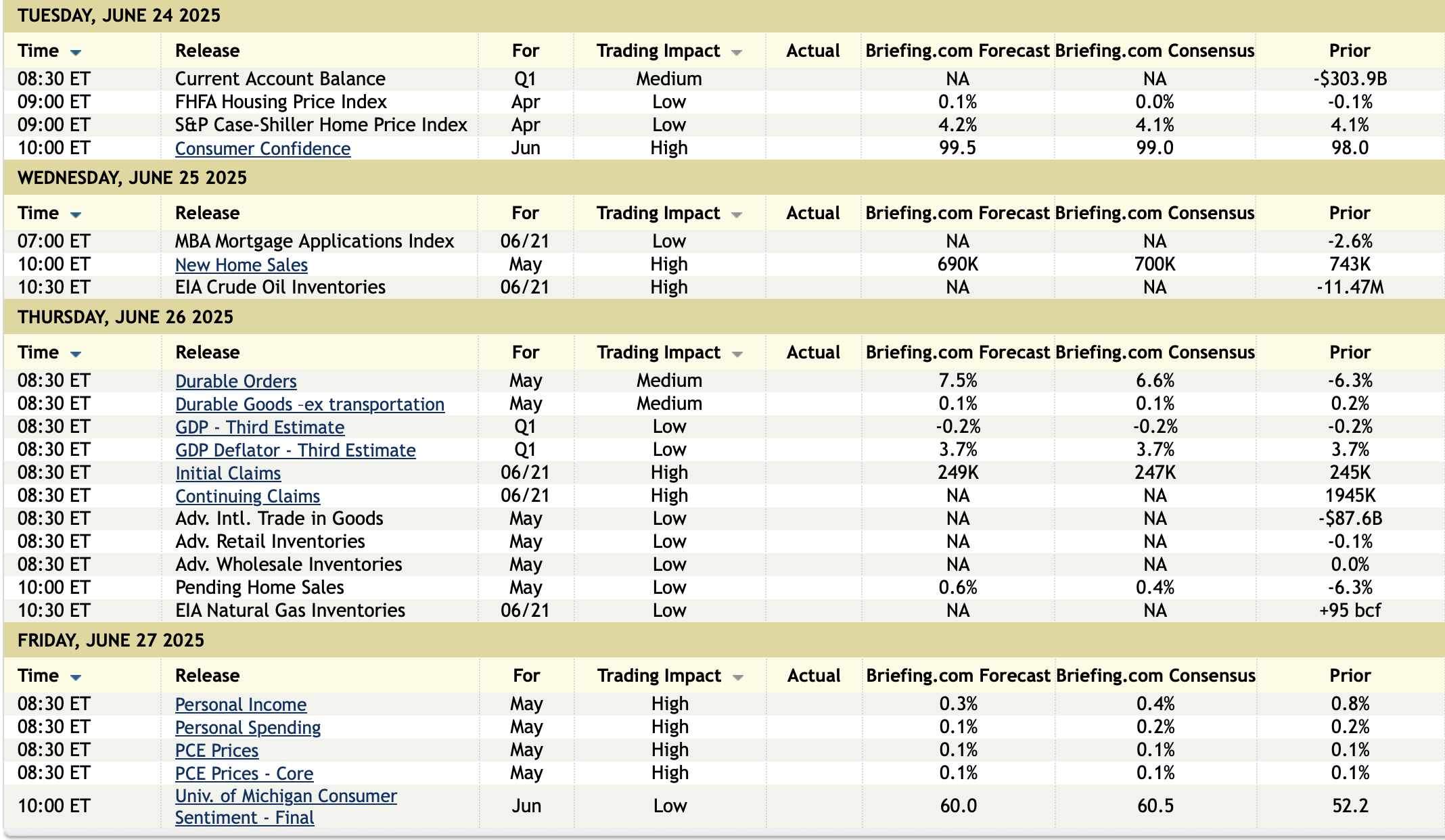 With Israel/Iran seemingly defused, the market is resuming its march to/through all-time highs.; the SPX is ~2% below ATHs and we are entering a seasonally strong period for the NDX. With this geopolitical risk behind us, the Market is refocusing on the macro picture, preparing for earnings, and watching the looming deadline on the expiration of the tariff moratorium. We shift our view back to Tactically Bullish with the bullish hypothesis based on resilient macro data, positive EPS growth, and thawing trade war rhetoric. An additional tail-wind comes from dovish Fedspeak and lower energy prices. Below we share some takes on the Israel/Iran situation before going into more detail on our view with the associated Monetization Menu.