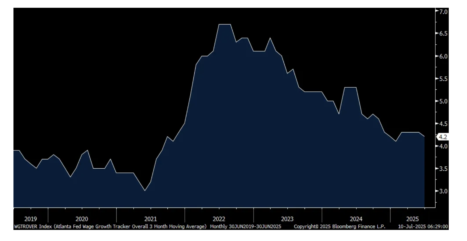 Ahead of the jobless claims data today, the Atlanta Fed's Wage Tracker came out yesterday and it showed 4.2% y/o/y growth in June vs 4.3% in May. Part of this is just an easy comp as it was up by 5.3% in June 2024 and still remains above the 3-4% range seen pre Covid. For a 'job stayer', the stat was similar, up 4.2% vs 4.3% in May. For a 'job switcher', wages grew by 4% from 4.1% and that actually is back in line with the pre Covid trend.