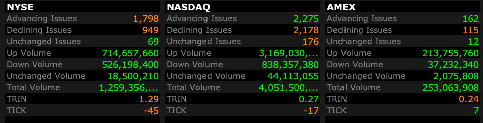 - Nasdaq volume 23% above its one-month average;