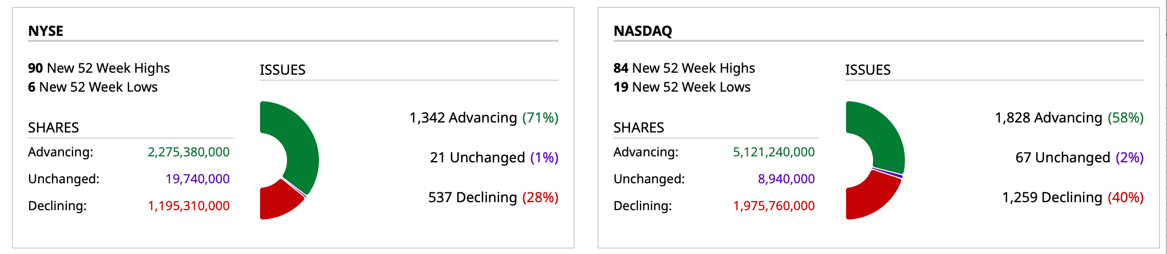- NYSE volume 2% below its one-month average;